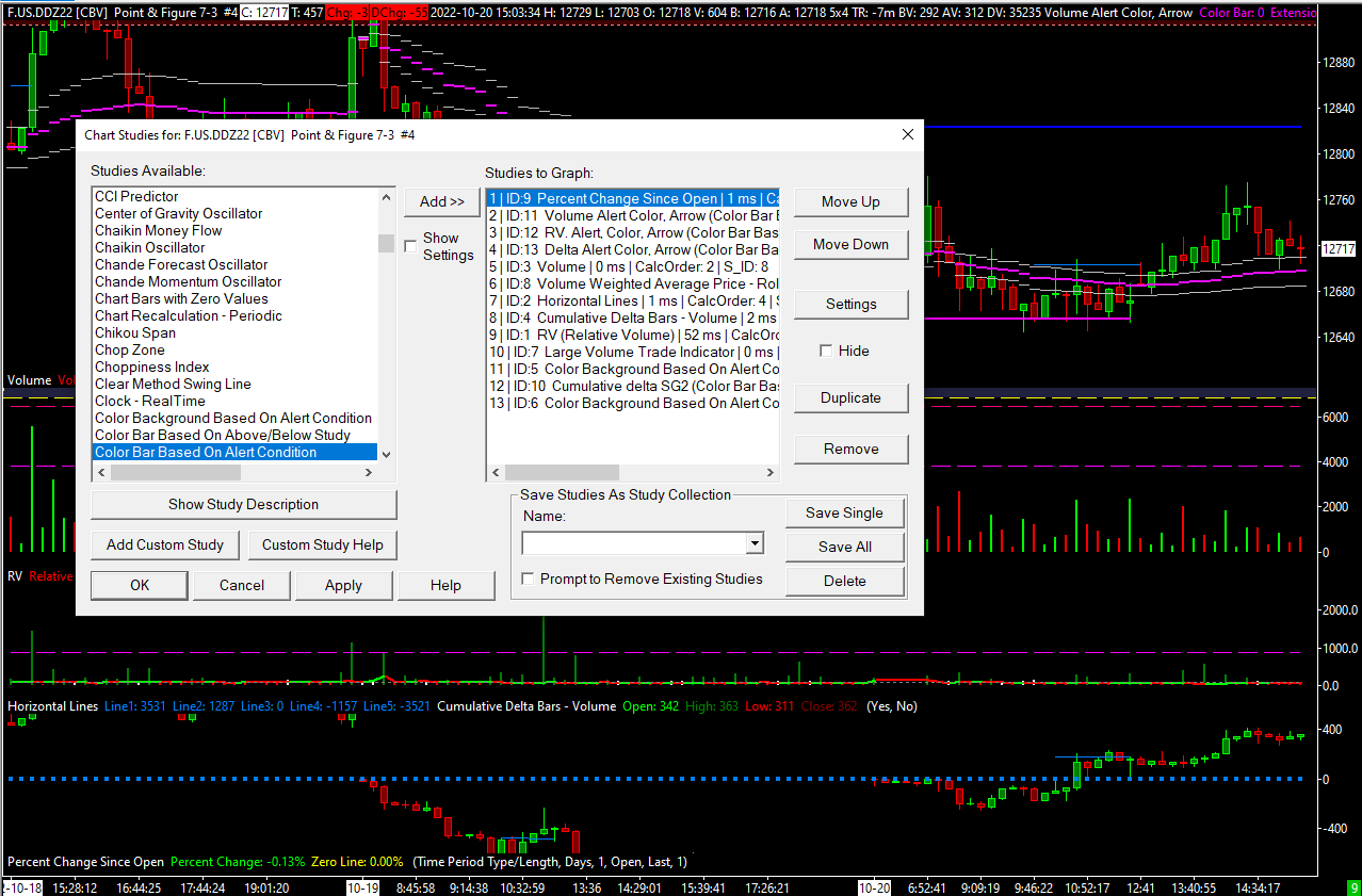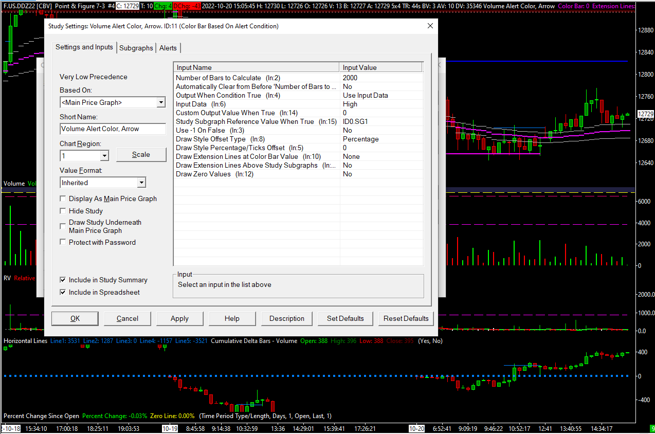 The post above was about a lower time frame. I have done the set-up on Point and Figure as well, but nothing is coming up, at all. What I wrote in my prevoius message, I had at least one arrow based on volume chart, but on point and figure I got nothing. Either way I would prefer to have arrows/dimonts etc. from volume, cumulative volume and cumulative delta. Better if the arrowds comes on the indicator rather than on the main graph. To sum up, low time frame gives arrows on volume and is not giving anything based on cumulative delta or relative volume alert set-up conditions. Point and figure is not generating any arrows, dimonds end so on, at all. I have attached a few printscreen, of Color Bar Based on Alert Condition for Point and Figure (on volume indicator, alert condition is the same as on Color Bar Based...). If we figure our what I am doing wrong here maybe I can adjust it for cumulative delta and relative volume as well. One more print screen will come in the next short message. |