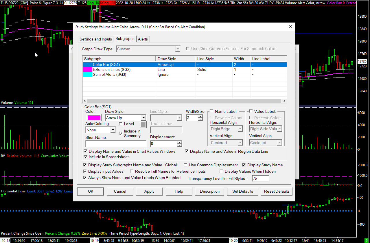 Everything looks fine. We suggest changing the size of the arrow to a width greater than 2, something more like 8 to begin with to ensure that you are able to see it and that it is not covered up. If you are still not seeing the arrow, then scroll the chart back to a point where the volume is greater than 8000 and you should have a pink arrow at the high of that bar (in the main price graph, not the Volume graph). If you are not seeing it, then please give us a screenshot of that portion of the chart. For the most reliable, advanced, and zero cost futures order routing, use the Teton service: Sierra Chart Teton Futures Order Routing |