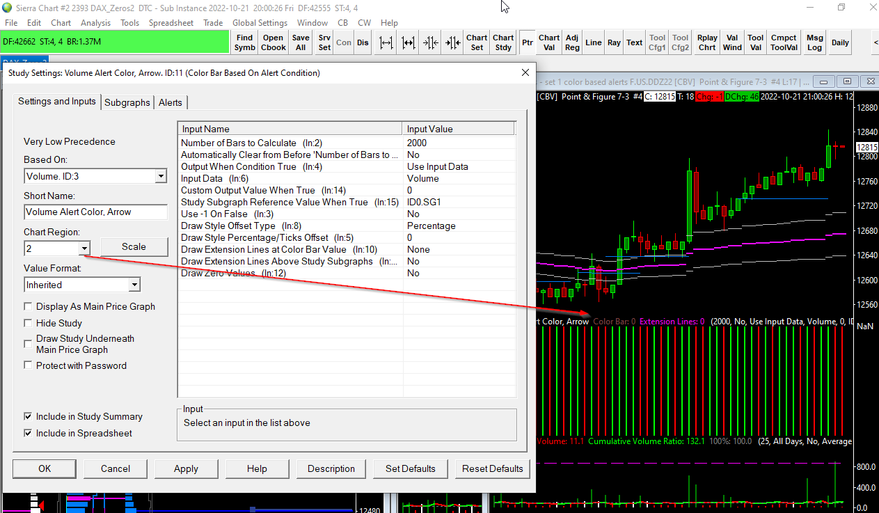 Set the following: - Based On: Volume (study) - Region: same as the region for the Volume graph - Input Data: Volume - Output When Condition True: Use Input Data --------- For the Cumulative Delta, you need to add the ID of the Cumulative Delta study to the alert. When you do not specify the ID then that means to use the Subgraphs of the study on which the alert is entered - in this case, the Color Bar Based On Alert Condition. For the most reliable, advanced, and zero cost futures order routing, use the Teton service: Sierra Chart Teton Futures Order Routing |