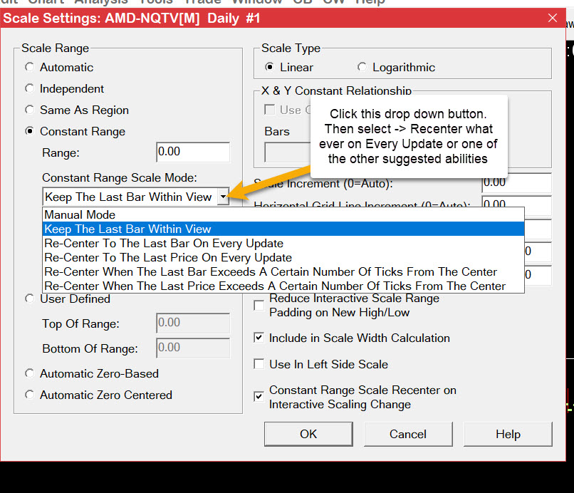 There are APIs relative to scaling and one is to know what the Constant Range value is. It would be up to your code to decide how far or how often you wanted to center the price. ACSIL Interface Members - Variables and Arrays: sc.BaseGraphScaleConstRange sc.BaseGraphScaleConstRange --- Type: Read/write float variable. The sc.BaseGraphScaleConstRange variable gets and sets the grayscale range for the chart base graph when it is using a Scale Type of Constant Range. Also may want to verify scale type. sc.BaseGraphScaleRangeType There are also some options for re-centering as seen in my attachment of the scale settings pop up window within existing UI. Hope this helps, JohnR |