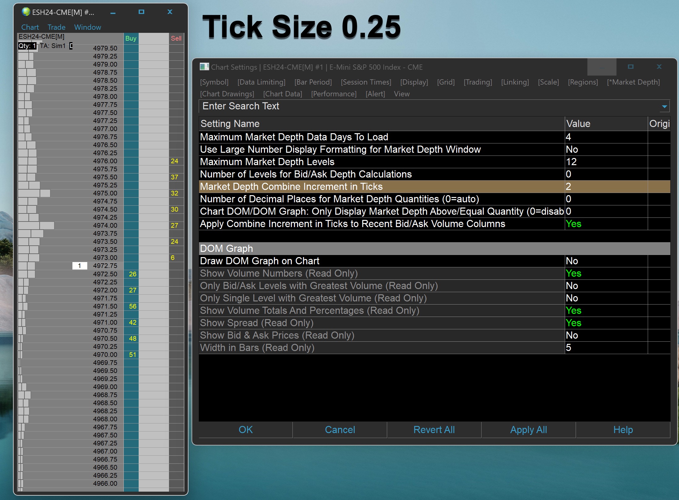 Do not change your tick size. Set the Tick Size back to 0.25. Then make the following changes: - Chart >> Chart Settings >> Market Depth >> Combine Increment in Ticks: 4 - Chart >> Chart Settings >> Market Depth >> Apply Combine Increment in Ticks to Recent Bid/Ask Volume Columns: Yes This should resolve your issues. For the most reliable, advanced, and zero cost futures order routing, use the Teton service: Sierra Chart Teton Futures Order Routing |