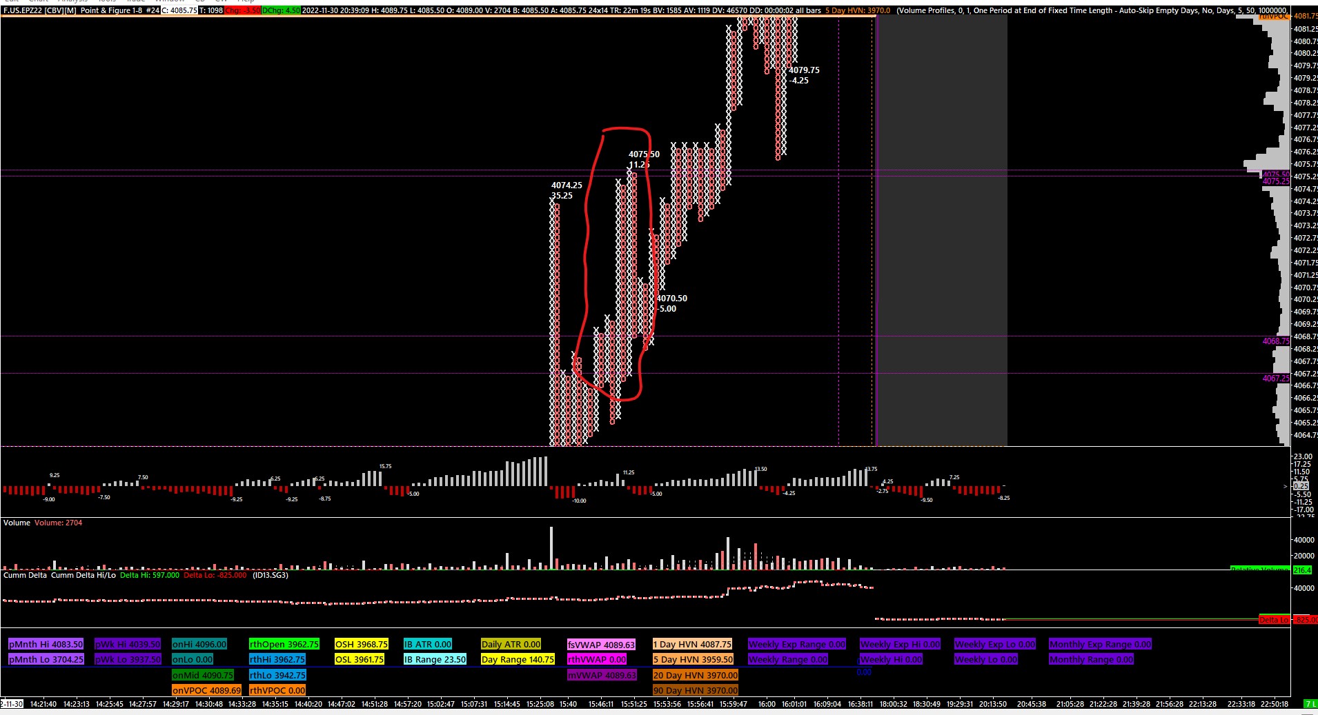 please note the first screen shot is a pnf chart 1-8...you can notice the bar pattern circled....for instance there is a bar with a zig zag above it 4075.5 ...11.5 the low of that bar is marked with a horizontal line = 4067.5 and the high is 4075.50..the bar next to this shows a low of 4068.75 and a high of 4075.25 the 2nd screen shot is a footprint chart with the bar type set as pnf 1-8 yet the bars look much different...notice the first bar is the same time as the pnf chart and yet the low is only 4068.25 and the second bar referrenced on the pnf chart shows a high of only 4073.5... |