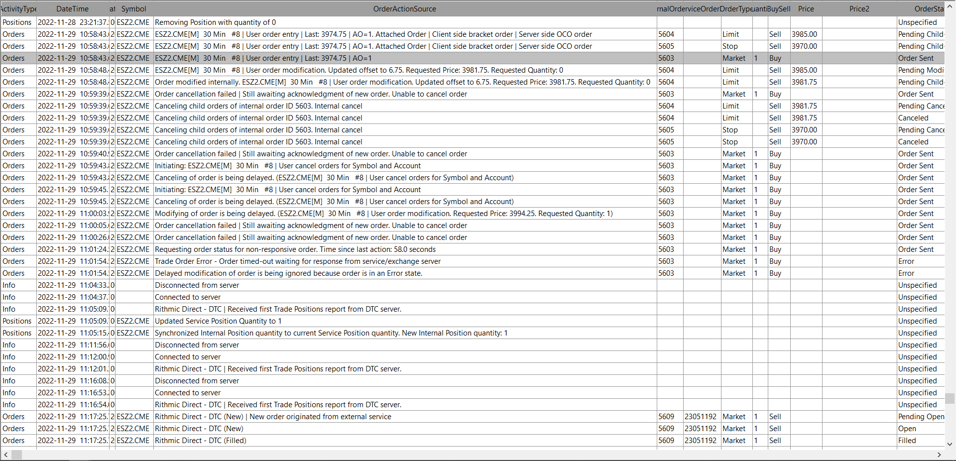 The order that you have highlighted with order ID 5603 was not responded to by Rithmic. This would have been a Rithmic issue. Or a communication issue. However, even with a communication issue, that issue would clear and then the state of the order would become available. This should not take any longer than about a minute. If you are doing live trading we definitely recommend using Teton order routing: Sierra Chart Teton Futures Order Routing Sierra Chart Support - Engineering Level Your definitive source for support. Other responses are from users. Try to keep your questions brief and to the point. Be aware of support policy: https://www.sierrachart.com/index.php?l=PostingInformation.php#GeneralInformation For the most reliable, advanced, and zero cost futures order routing, use the Teton service: Sierra Chart Teton Futures Order Routing Date Time Of Last Edit: 2022-11-30 14:37:26