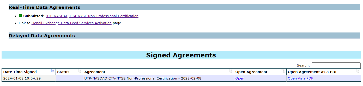 You are correct, there is just the one agreement for that exchange. Your agreement has been reviewed and accepted. You can activate the exchange at the following link: https://www.sierrachart.com/UserControlPanel.php?page=DenaliDataFeedSTOCKS#Exchanges For the most reliable, advanced, and zero cost futures order routing, use the Teton service: Sierra Chart Teton Futures Order Routing |
