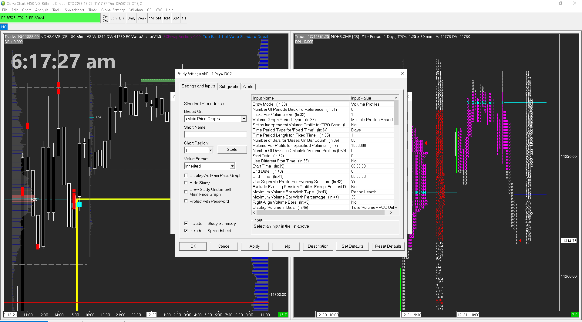 As long as the session times are the same and you have specified the Volume POC, you should get the same result. But we are confused by what we see for the Volume Profile for the trading day of December 20 (starting at 18:00 December 19). The Volume Profiles for those two days do not seem to match up, which indicates that the settings are not all the same.