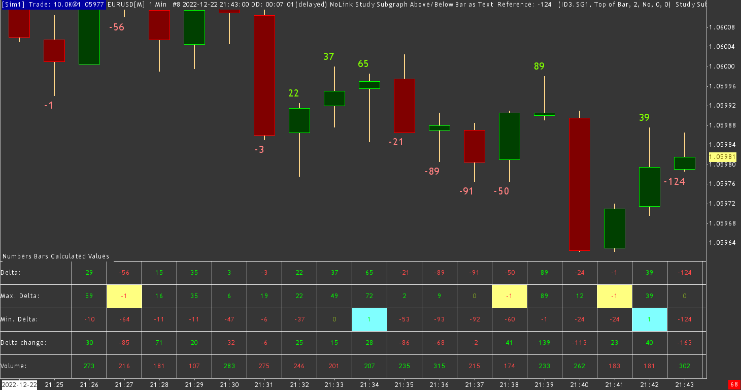 The fact that the value of -1 in the Max Delta is getting colored the Range 3 Down Color makes sense, since this is the largest negative value. What is odd is that we are getting the +1 values colored the Range 3 Up Color for the Min Delta. The following is an image of what we see where we changed the Range 3 Up/Down colors to stand out (yellow and blue). We really do not know why the Min Delta is not coloring in the image you provided - it should be - unless there is another value somewhere that is greater than 1. https://www.sierrachart.com/image.php?Image=1671743526658.png For the most reliable, advanced, and zero cost futures order routing, use the Teton service: Sierra Chart Teton Futures Order Routing |