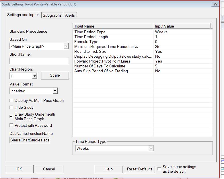 Use the study Pivot Points-Variable Period: http://www.sierrachart.com/index.php?l=doc/doc_PivotPoints.html#s223 And set the Time Period Length and Type inputs to 1 Week. And set the Number of Days To Calculate input to a value greater than 7. Sierra Chart Support - Engineering Level Your definitive source for support. Other responses are from users. Try to keep your questions brief and to the point. Be aware of support policy: https://www.sierrachart.com/index.php?l=PostingInformation.php#GeneralInformation For the most reliable, advanced, and zero cost futures order routing, *change* to the Teton service: Sierra Chart Teton Futures Order Routing Date Time Of Last Edit: 2014-06-09 19:25:17