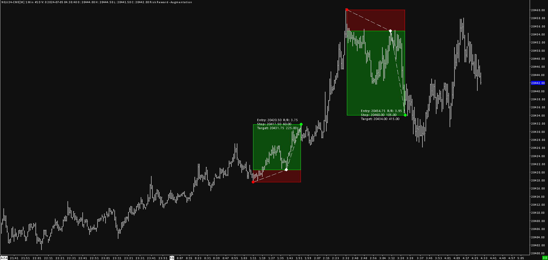 Here you go, not as good as a native tool for sure. Risk Reward - Box uses chart drawing tools to add r:r boxes to most recent r:r drawing Risk Reward - Augmentation uses ACSIL graphics interface to add boxes to all visible r:r drawings Not sure they are the most performant solutions, especially if you have lots of other user added drawings. Risk Reward - Augmentation should only be used with OpenGL as this has alpha channel (transparency) implemented. Maybe I could do a native GDI version so transparency works without OpenGL, but this is enough for now. User431178 doesn't have that tool: his gif was only showing what it would look like (in a dream LOL). Urrrrr, ok Date Time Of Last Edit: 2024-07-05 09:09:35