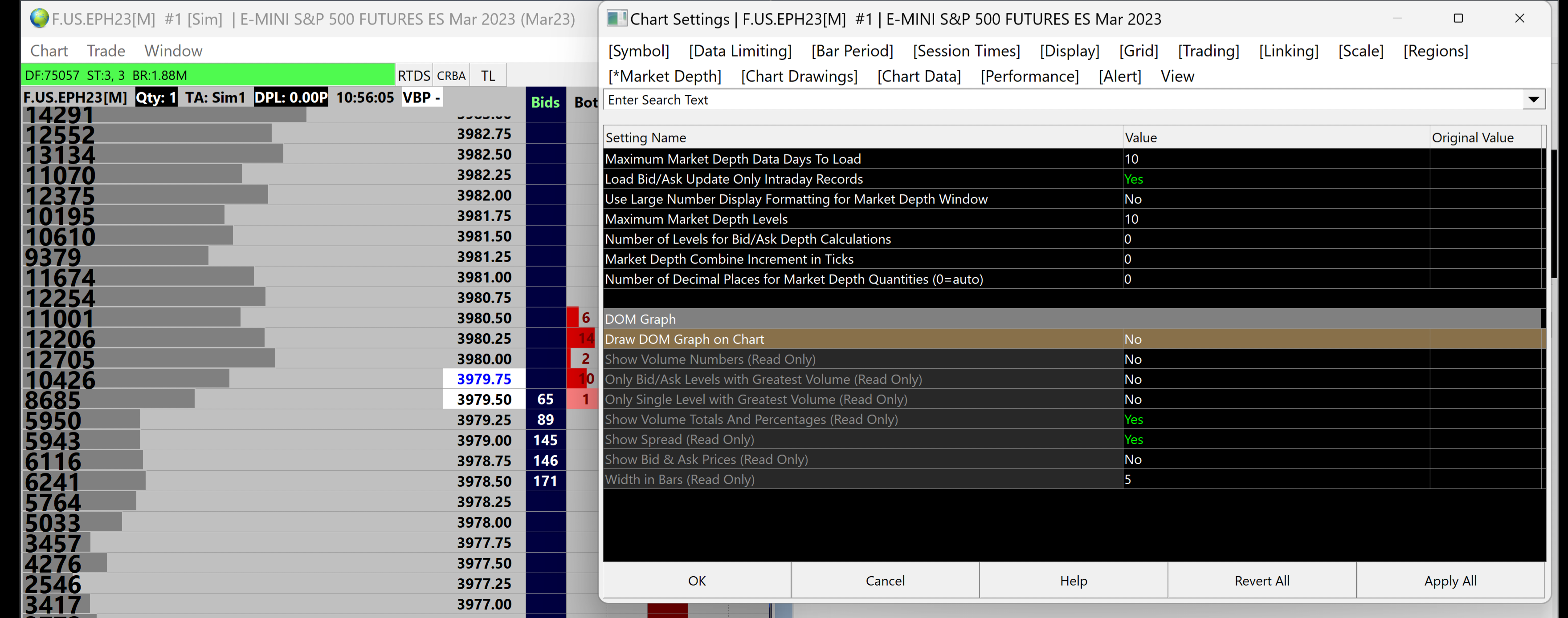 Change the setting for Maximum Number of Market Depth Levels. You have this set to 10. If you want 10 on each side then it needs to be 20. If you want all the Market Depth, then set it to 0. Refer to the following regarding this setting: Chart Settings: Maximum Market Depth Levels (Chart >> Chart Settings >> Market Depth menu) If this does not resolve your issue, then refer to the following: File Menu: Not Receiving the Full Number of Market Depth Levels For the most reliable, advanced, and zero cost futures order routing, use the Teton service: Sierra Chart Teton Futures Order Routing |