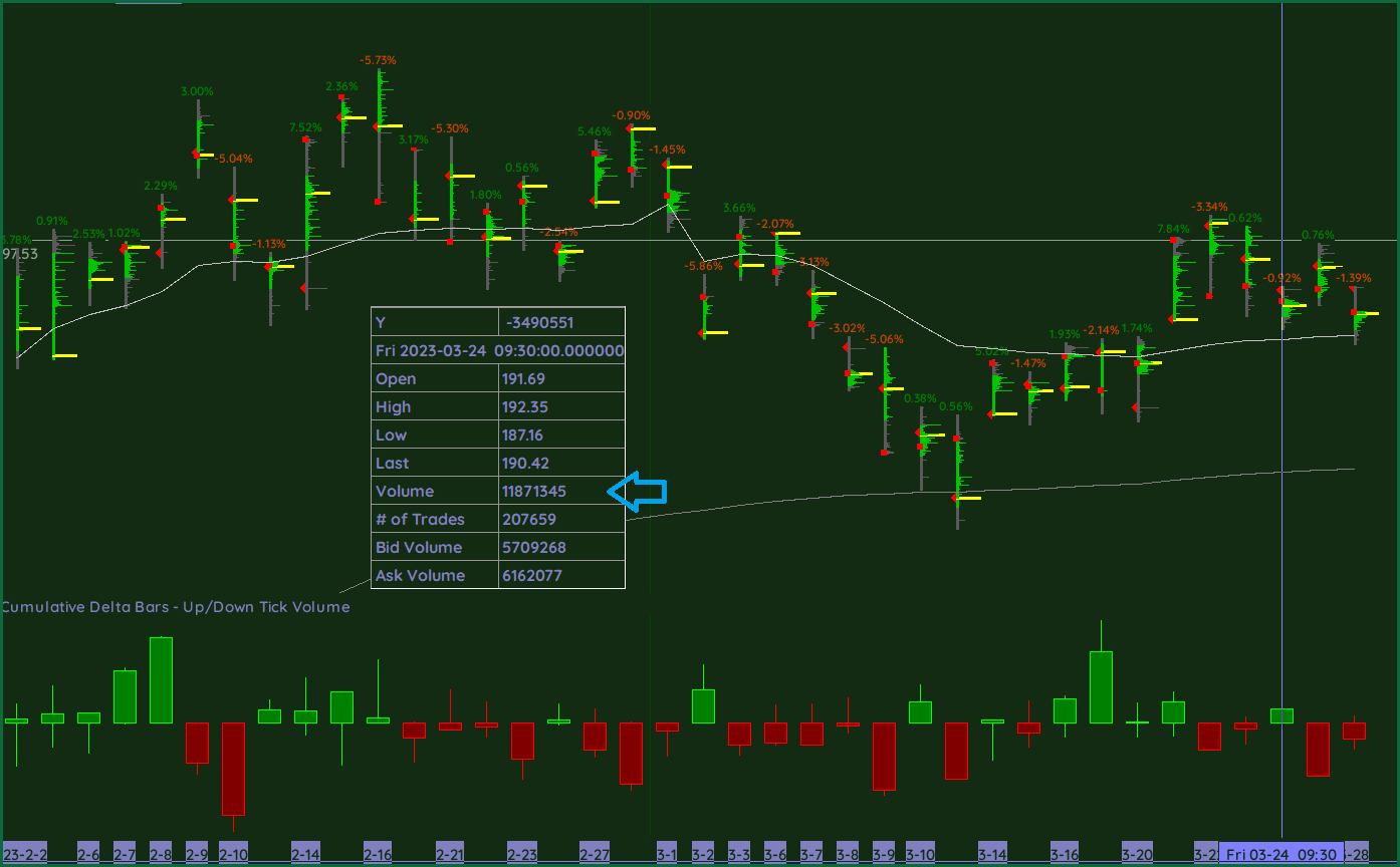 I have noticed the volume totals for stock symbols is quite different when using -NQTV compared to just the symbol alone. For example TSLA on 3/24 shows a daily volume of 96.2 million, where TSLA-NQTV shows 11.87 million for the same day. I would just use the non-NQTV symbol, however cumulative delta does not display correctly when using Intraday data, as shown in the picture, unless NQTV is used.