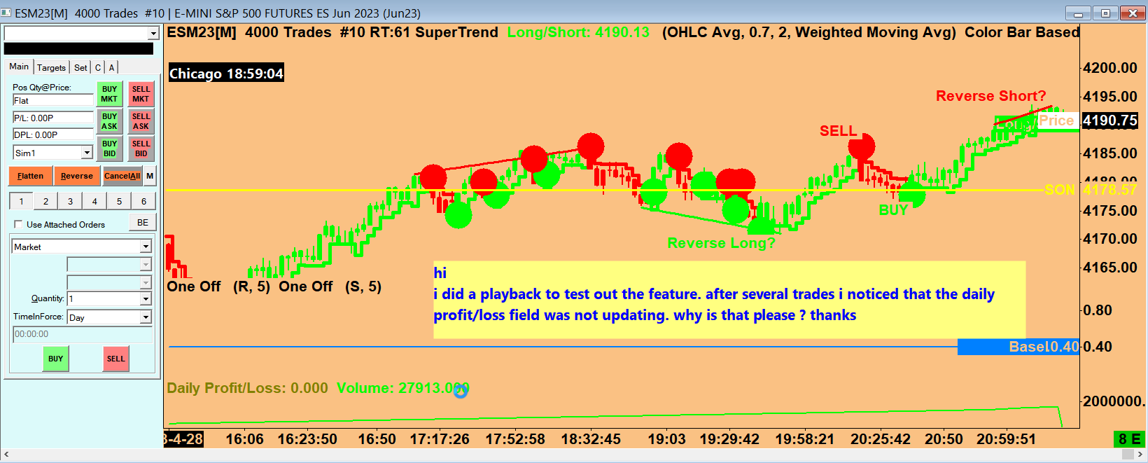 Regarding post #9, this is comprehensively explained here: Trade Simulation: Viewing Positions and Current Profit/Loss secondly, is it possible to configure what columns i want to view in the trades and chart stats tabs within the trade activity log? The columns can be reordered and you can change the width:Trade Activity Log: Column Widths and Font The columns can be reordered by left clicking on the header lines and dragging them left or right. The Trading Evaluator service has no integration with a chart replay on the users installation of Sierra Chart: why then cant one use that option when running a playback to get results to display in trade positions and trade account pls ?