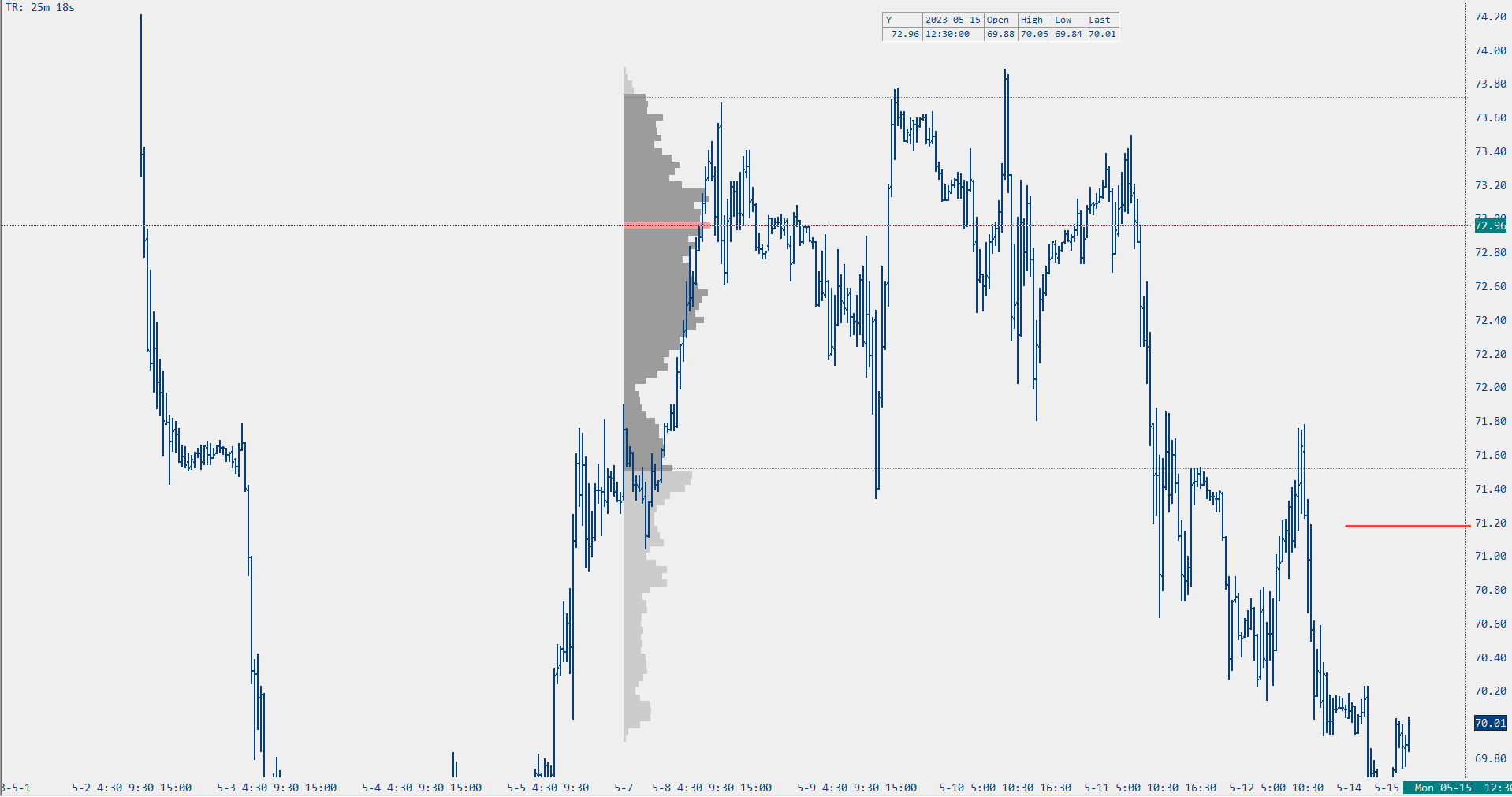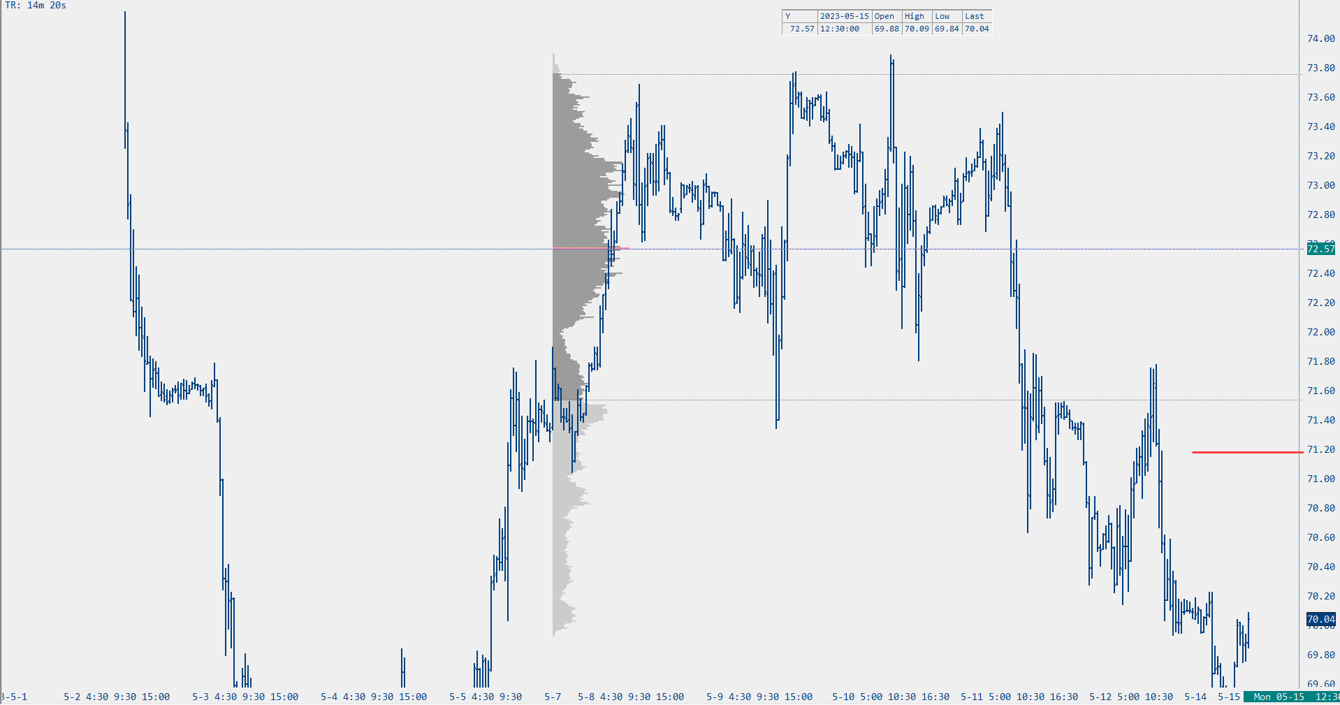 Hello, I was playing around with the study "volume by price" when to discover a huge discrepancy in the VPOC when I tried to "smooth out" the profile by changing the "Ticks per volume bar (ln33) input. I applied this study to a 30' chart and I just wanted to have the profile view a little smoother, so I increased the aforementioned input to 4 instead of 1 (default setting), so to have 4 ticks for each price level volume count instead of the single tick by tick. Doing so, changed dramatically the VPOC level shown on the chart. Attached is just an example of the issue, which comes from a 30' chart of the most recent CL contract (CLEM23). The more "granular" view of the profile is the default setting input (1), which shows the VPOC at 72.57 The more "fatty" view of the profile is the smoothed setting input (4), which shows the VPOC at 72.96 (39 ticks higher). I understand that using a less granular view will smooth out the single tick in a general area, and I am totally ok with it. However, here we're talking about a completely different VPOC. How can that be? This issue is present in every single market, not just CL (I trade ES, CL, 6E, GC) and the problem persist across the board. Also, if I change that input from 4 to another number, the VPOC changes again. Can you please help me out? What can cause such a huge different in VPOC? Another problem I have is when I display, side by side, TPO and VBP. Due to the fact that my TPO chart is smoothed out, this issue persists on this chart as well, and it cannot be modified since VBP will be identical to the TPO and cannot be changed. Look forward to hearing from you. Thanks, F. Date Time Of Last Edit: 2023-05-15 07:46:18
