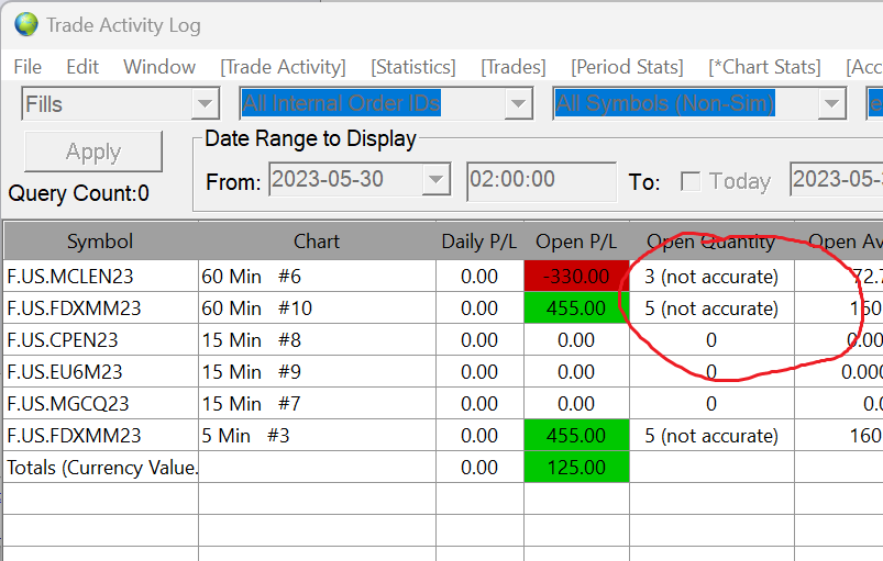 Refer to: Trade Activity Log: Solving Inaccurate Trade Statistics for Charts Field Values Sierra Chart Support - Engineering Level Your definitive source for support. Other responses are from users. Try to keep your questions brief and to the point. Be aware of support policy: https://www.sierrachart.com/index.php?l=PostingInformation.php#GeneralInformation For the most reliable, advanced, and zero cost futures order routing, use the Teton service: Sierra Chart Teton Futures Order Routing |