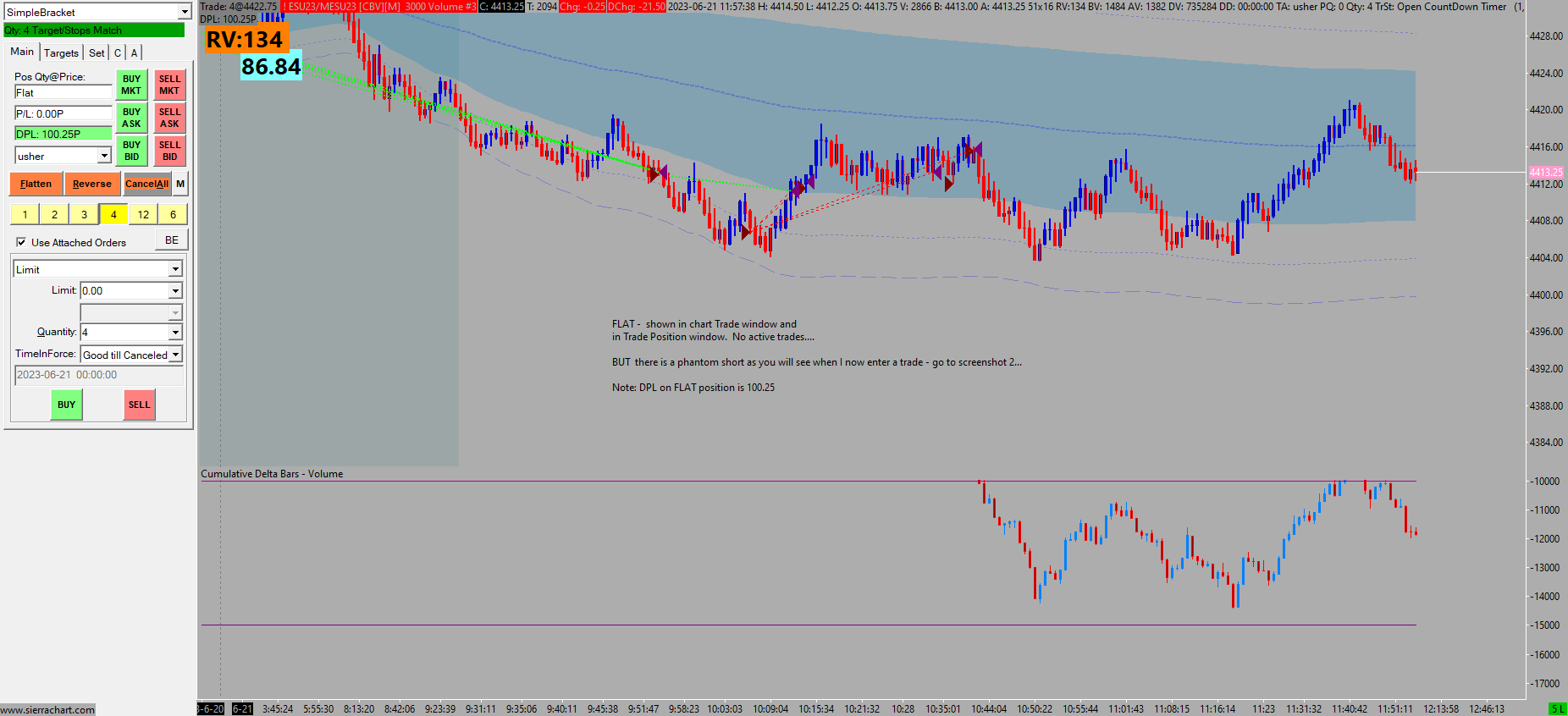 Please read carefully what i've written, and refer to the screen shots. My position is showing FLAT - nothing in Trade Position Window and FLAT on Chart Trade Window, as one would expect. HOWEVER, there is a constant phantom short position being held. Upon entering a new trade, the phantom short flattens and re-enters. This is shown in the screen shots I have already sent. I will action this AGAIN with the trade position window showing also - notice in SCREENSHOT 1: FLAT in trade window and FLAT in trade position window, and on chart. However behind the scenes there is a phantom short - now to SCREENSHOT 2: SCREENSHOT 2: Upon entering a trade, the phantom short flattens https://www.sierrachart.com/image.php?Image=1687363059172.png https://www.sierrachart.com/image.php?Image=168736327326.png |