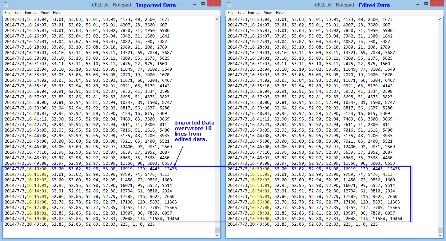The US stock exchanges closed at 1:00pm today so the charts have lots of data plotted with dashes. With SierraChart version 1109 and prior, I edited the charts to remove data after 1:00pm to clean up the chart. My procedure is Edit, Export and Edit Intraday Data, then highlight and delete the data 1:00pm and beyond but I leave the last line so Sierrachart can start update from that date and time. Saved the file then, Edit, Import and Load Intraday Data. I did the same procedure today with version 1156 but when I imported and loaded the edited intraday data, I get out of order timestamp errors. To check the data that was imported, I exported the intraday data and saw that the last 10 lines before the last line were overwritten with data causing timestamp errors. I tried the same procedure with 2 other stocks and had the same problem. Please advise. Date Time Of Last Edit: 2014-07-04 03:51:55