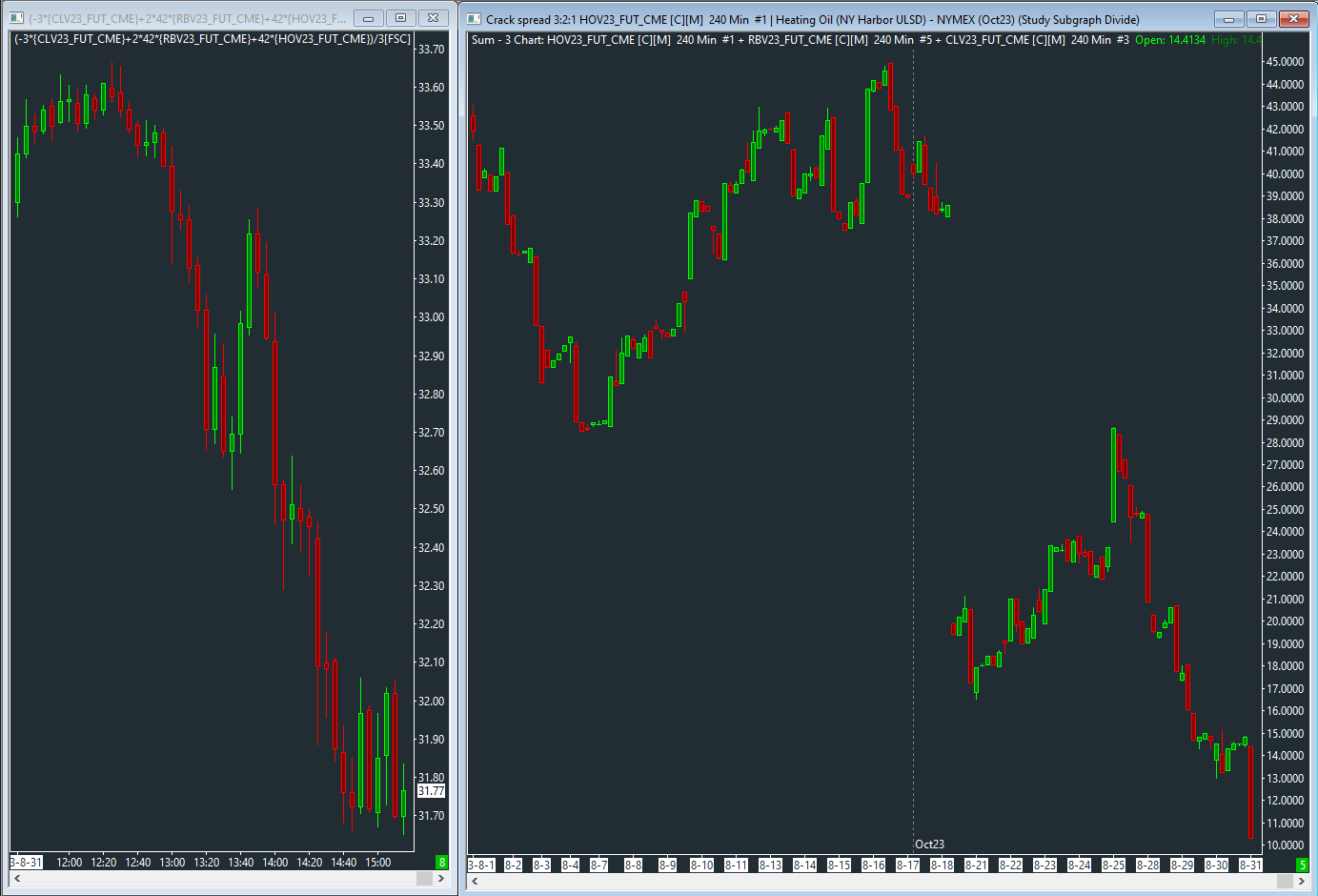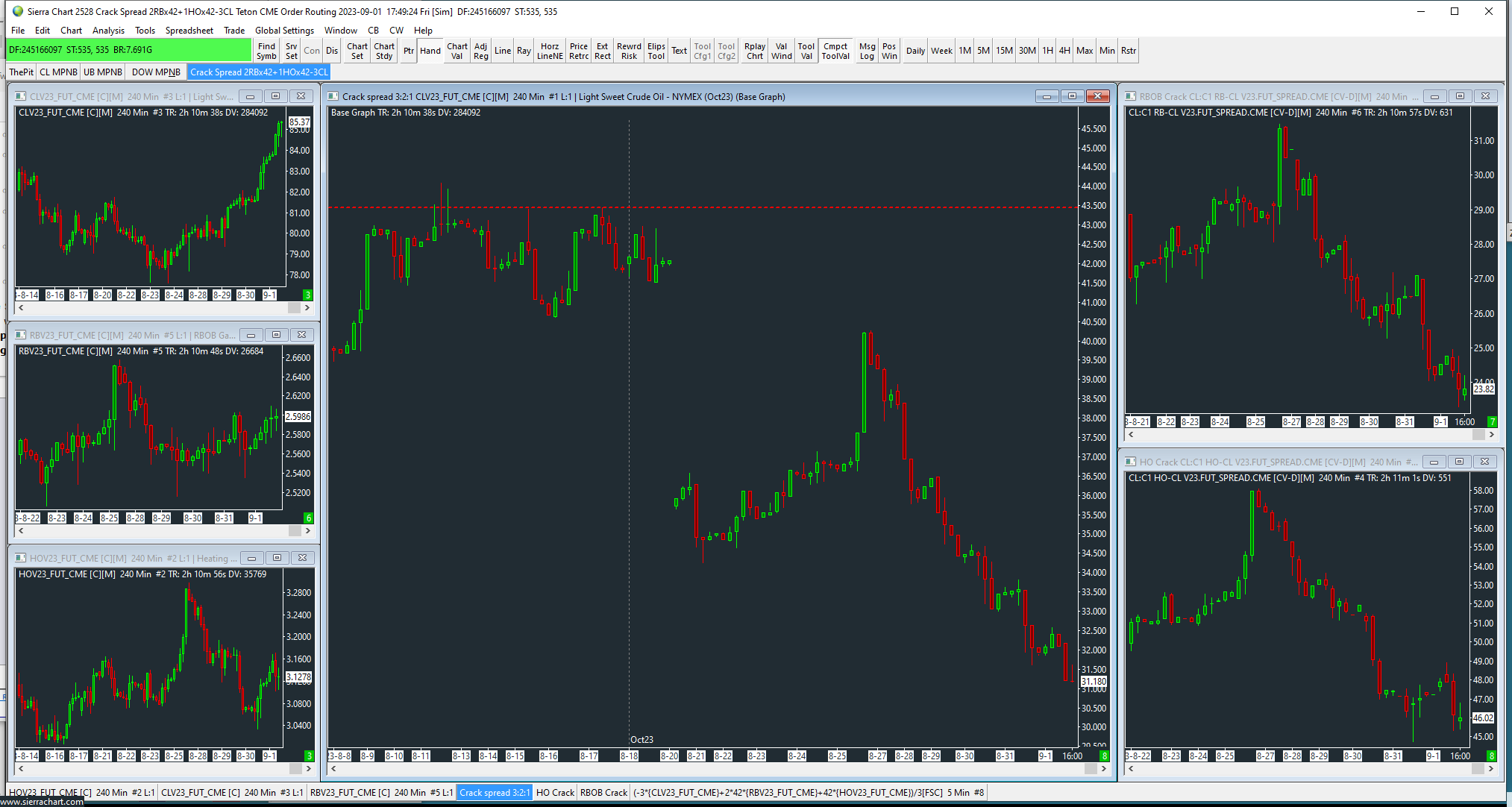 Based on how your "Crack spread 3:2:1" is setup we are not sure how you got anything to display. In fact, you should not have, as you had the "Study Subgraph Divide" set to be the Main Price Graph, and since the "Based On" was set to "Main Price Graph", you had it dividing itself. Also, the Study Subgraph Divide only gives you a single value - the Last. If you want to see bars then you have to do this a different way. Since you are wanting to view the spread using the Continuous Data, you would have to have a total of 4 charts. 3 are the standard charts for RV, HO, and CL, and the 4th can be any symbol - you just need this fourth to bring in the data from the other 3. In the 4th chart use 3 copies of the Study/Price Overlay to bring in the data from the other 3 charts. Then you would use the "Spreadsheet Formula - Bar" to display the spread by entering in a formula for each item - Open/High/Low/Close. The Formula would look like the following for the Open: =(-3 * ID1.SG1 + 84 * ID2.SG1 + 42 * ID3.SG1)/3 Where ID1 is the overlay for the CL, ID2 is the overlay for the RB and ID3 is the overlay for the HO. Where the ID of each study would stay the same, but the SG numbers will change for each item - Open/High/Low/Close. You could then set the Spreadsheet Formula - Bar to be the Main Price Graph. For the most reliable, advanced, and zero cost futures order routing, use the Teton service: Sierra Chart Teton Futures Order Routing |