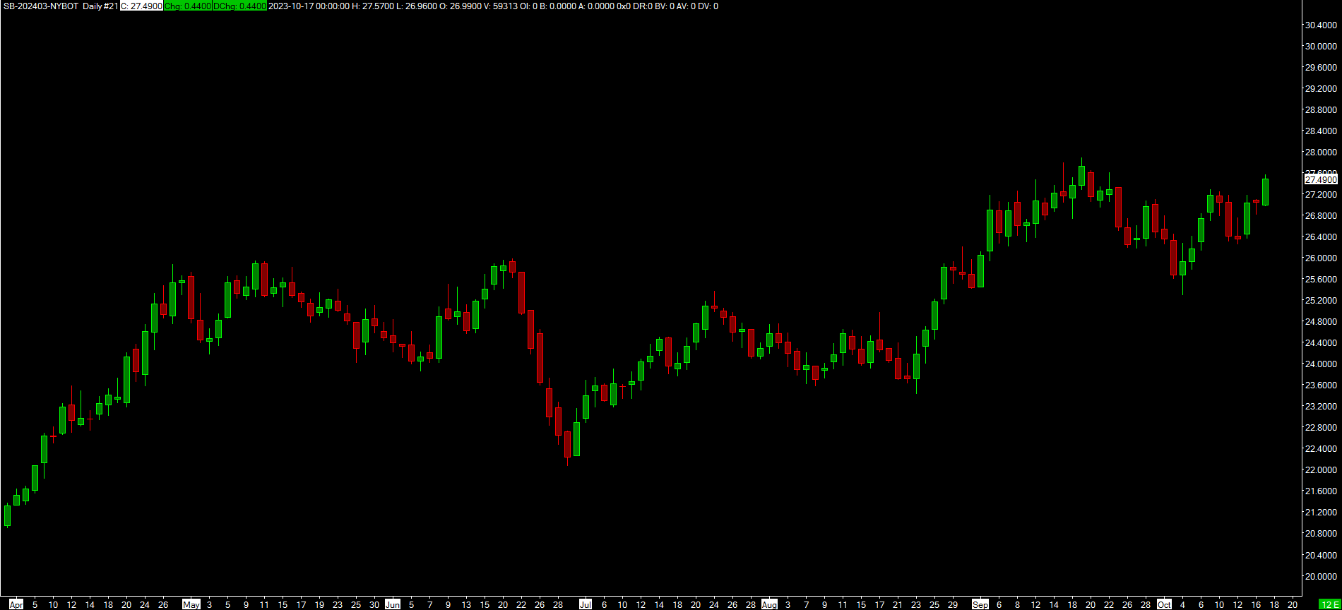 Are you able to get ICE real-time intraday data for Sugar? I am thinking about subscribing to the ICE real-time data feed through IB for DX Dollar trading. Open up your Chart Settings Window for the Sugar Daily Historical Data Chart. Under Symbol Settings, change your Historical Price Multiplier to 100. When I loaded the Sugar Daily Historical Data Chart, I had to change the Historical Price Multiplier to 100 because the price data was showing up as 27 cents not $27. If you like at your Sugar Daily Historical Chart, the green dashed line at the bottom looks like 27 cents. If you look under Global Settings >> Symbol Settings and find SB-######-NYBOT, the Default Historical Price Multiplier is 0.01. So the Historical Price data is being multiplied by 0.01. You can change this to Custom 1 instead of Default 0.01. This might be the better solution instead of changing the Chart Settings Window >> Symbol Settings. I tried this method and re-downloaded the chart and it changed the historical data from 27 cents to $27. Also you could ask John in SC Support to change the default settings to 1 and then Update From Server. https://www.sierrachart.com/image.php?Image=1697608553573.png Date Time Of Last Edit: 2023-10-18 07:04:39