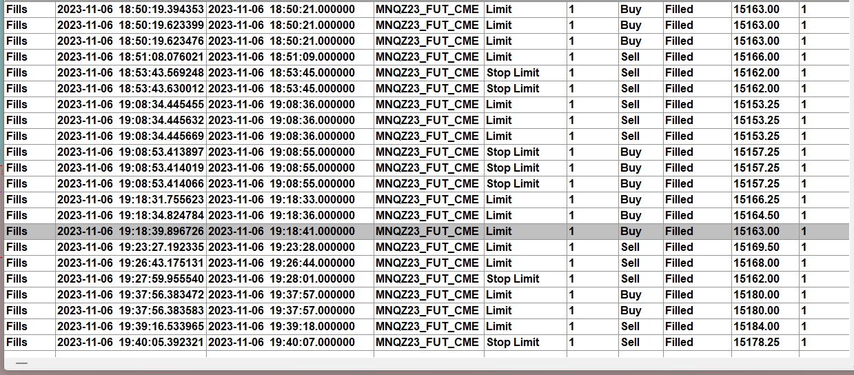 Can you get us an image of your chart where you placed the orders, showing the Order Fills on the chart and have the chart scrolled back to where the first trade occurred (09:24:58). Follow these instructions to get us your image: Support Board Posting Information: Attaching or Posting a Screenshot/Image (Optional) Also, what is the Time Zone of the chart set to (Chart >> Chart Settings >> Session Times >> Time Zone)? If the Chart Time Zone is set to "Use Global Time Zone" then what is your Global Time Zone set to (Global Settings >> Time Zone)? For the most reliable, advanced, and zero cost futures order routing, use the Teton service: Sierra Chart Teton Futures Order Routing |