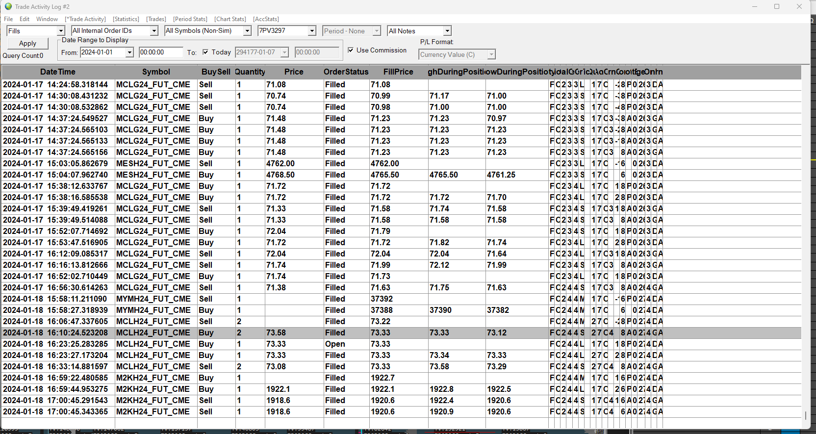 here are the actual trade times for each of my trades today...the first time column is the entry and the second time column is the exit time....the time has been incorrect in all my trades, I can provide all the trades and the real times if you would like 1/17/2024 9:24:58 AM 9:37:24 AM MCL 1/17/2024 9:24:58 AM 9:37:24 AM MCL 1/17/2024 9:30:08 AM 9:37:24 AM MCL 1/17/2024 9:30:08 AM 9:37:24 AM MCL 1/17/2024 10:03:05 AM 10:04:07 AM MES 1/17/2024 10:38:16 AM 10:39:49 AM MCL 1/17/2024 10:52:07 AM 11:12:08 AM MCL 1/17/2024 10:53:47 AM 11:16:13 AM MCL 1/17/2024 11:52:02 AM 11:56:30 AM MCL Date Time Of Last Edit: 2024-01-18 00:40:37