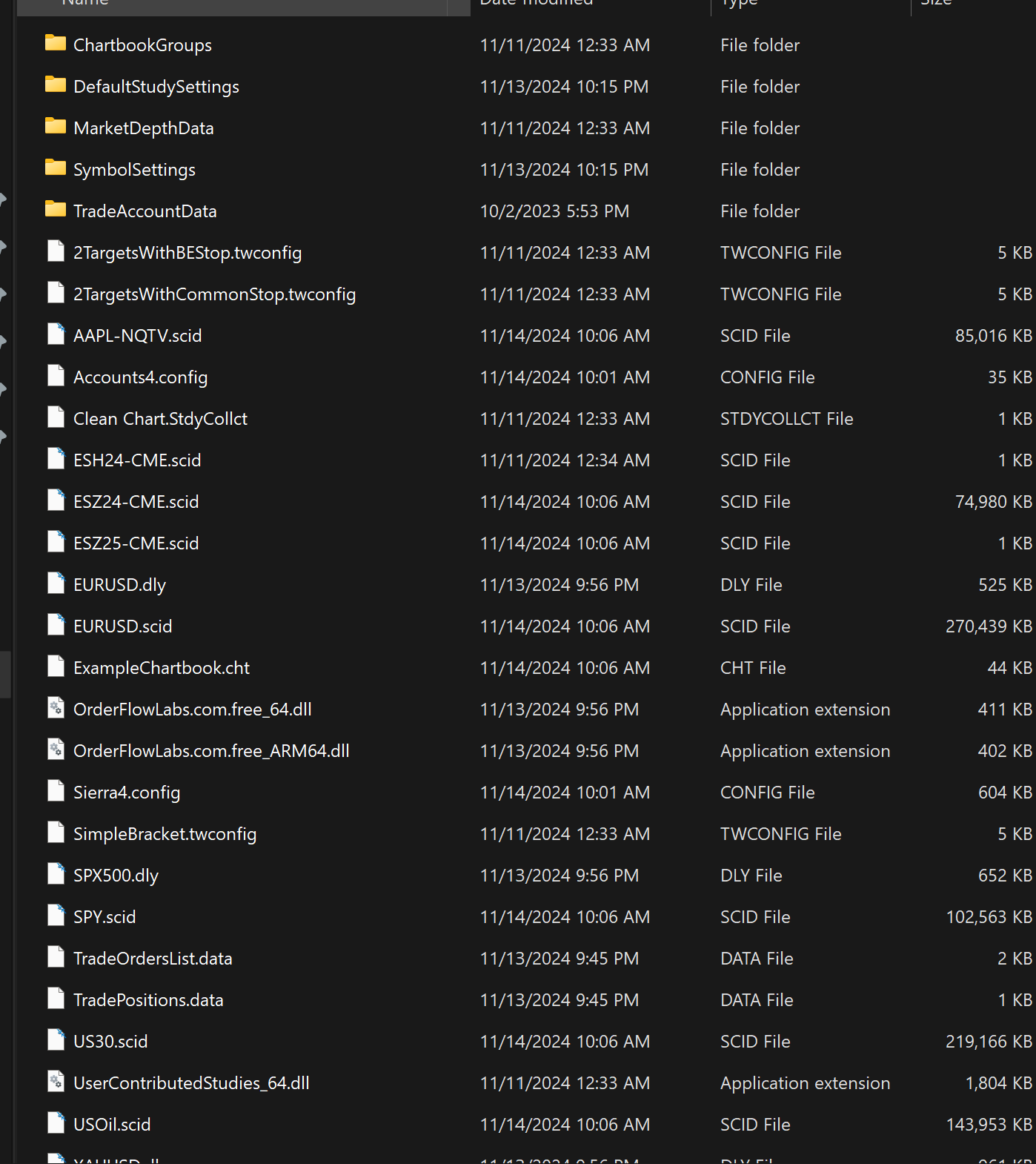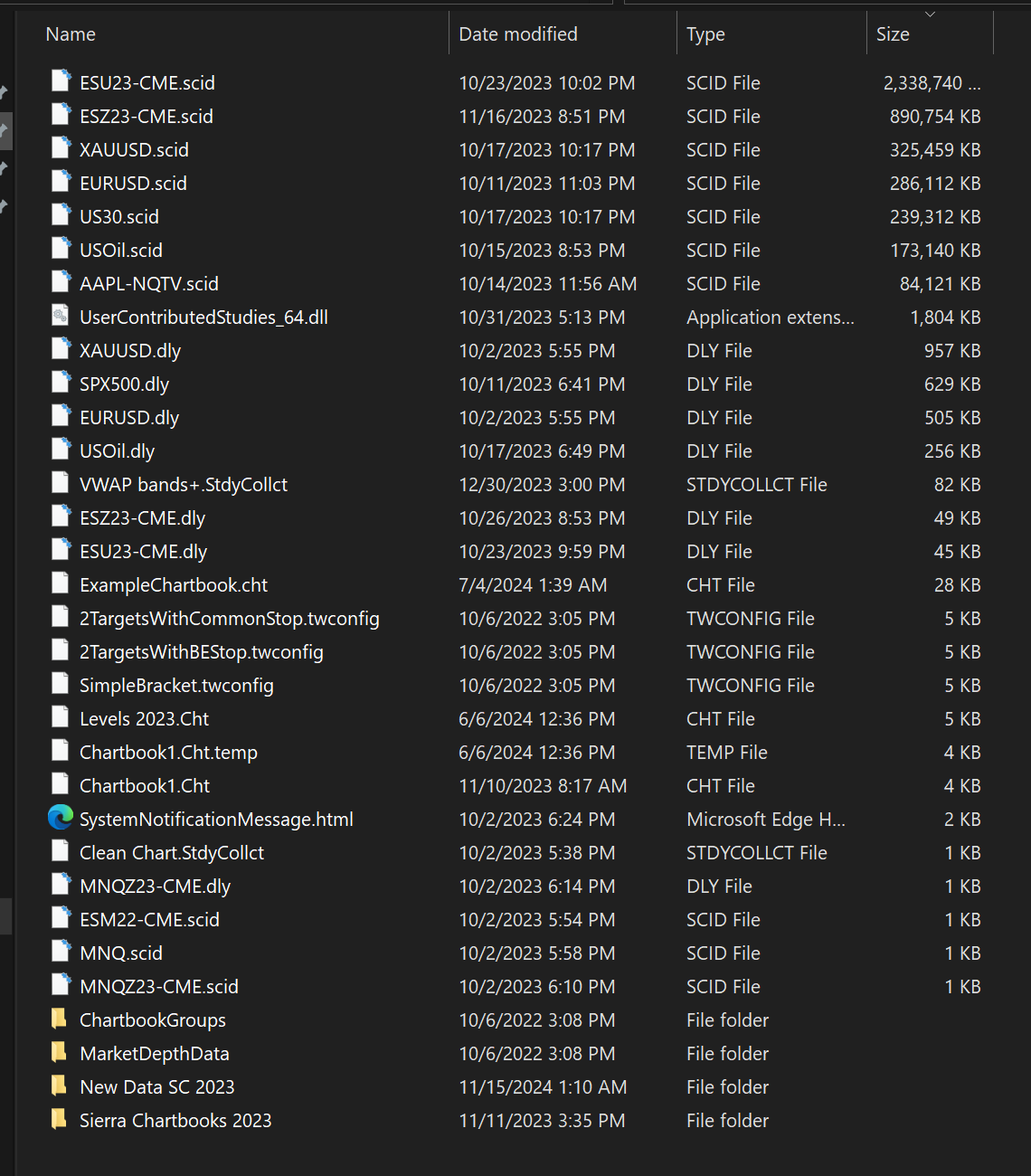 I was at work responding by memory but now i'm home. So no you were correct when I select open chartbook the charts I've built are there. But again on my main computer when I go to the C drive/Sierra chart/Data none of my built chartbooks are in there. But if I go to the C drive/sierra/backups they are in the backups folder. I've attached images of both the data and backups folder. |