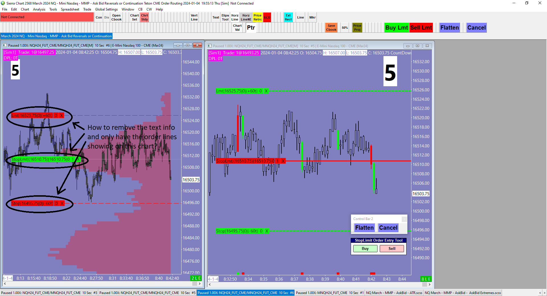 I have two charts showing with chart trading activated on both charts. On one chart (see chart #5 on attached file...chart is on the right hand side), I desire to see the order info as shown. On the other chart (see chart #6 on the attached file...chart is on the left hand side), I desire to only see the horizontal order lines with no text....just a horizontal order line. How do I completely remove all text info from the order lines on chart #6?