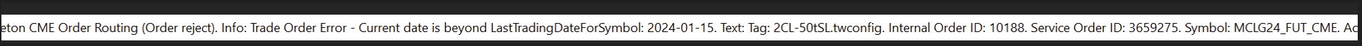 The error is stating that the last trading date for the symbol is January 15, 2024 which is why you are not able to enter a trade. We have to admit to being a bit confused, as we just verified on the CME Group website that the date for end of trading is 5 days before the 25th day of the month prior to the contract month. This would mean that it should be the 18th of January, not the 15th. Additionally, there are still trades occurring. We are checking on some things as to why you might have received this message early. The simplest solution is to change to the H contract and trade that instead. For the most reliable, advanced, and zero cost futures order routing, use the Teton service: Sierra Chart Teton Futures Order Routing |