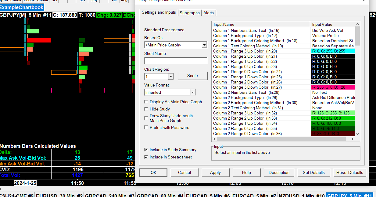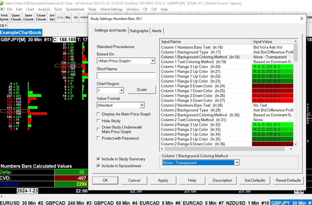 Hi, I've been fiddling with number bars and I can't figure how to go around imbalances. I've put Ask/Bid in Column1 , Delta Profile in Column2. Then, I'm supposed to set most of the ranges to transparent (how?) and set compare thresholds. When I do so, some of the bid/asks go blank, as there's no transparency to leave the lower thresholds intact. Can you advise ? (I'm not sure if the screenshot has come through) |