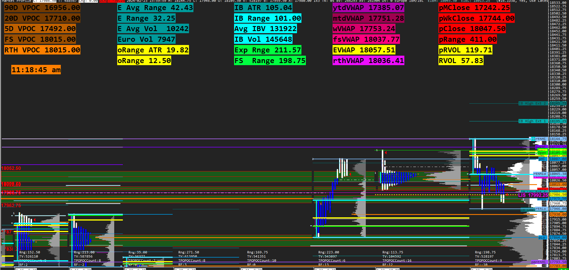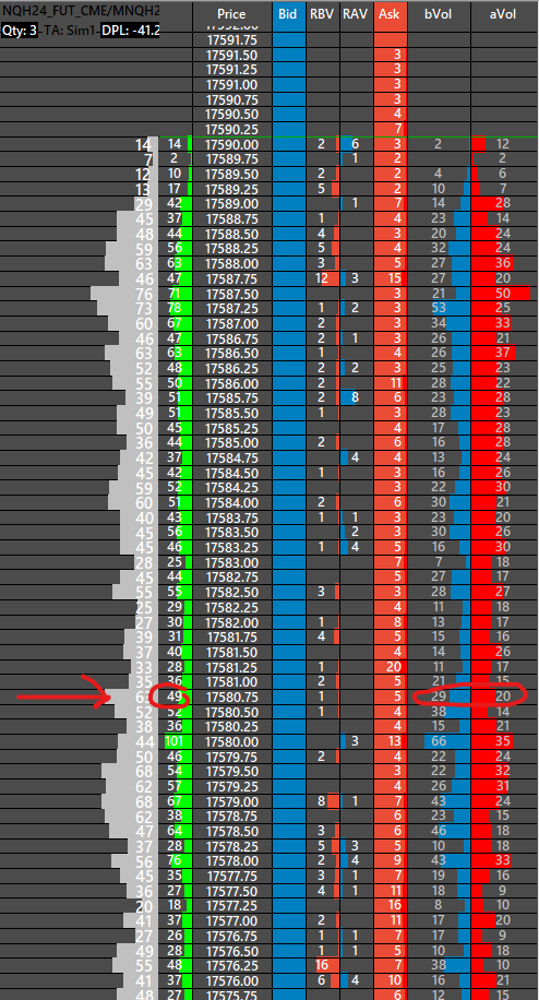 There is not. I am a little confused with the volume profile and the current total volume....so here is a picture of my dom...from left to right...there is a volume profile with a delta profile overlayed on top of it...at price 17971.50 it reads a delta of 375 . the next column is the total curernt volume which reads 98...the last 2 columns are the bid total current volume and the ask total current volume....added together they equal 98...as I said this is the first time we have trade here since 2/12/2024 how can the delta show 375 if the volume traded at price is only 98 contracts?
