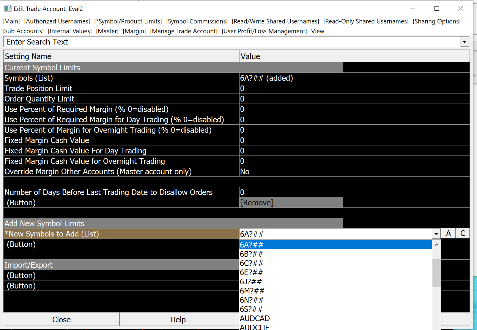 Once the new symbol is added to the Symbols (List) drop down on the Symbol/Product Limits menu of the Evaluator account, is there an option to remove any of the symbols currently on that list? We are adding the symbols by using "New Symbols to Add (List)" option under the "Add New Symbol Limits" section and they appear on the "Symbol (List)" under the "Current Symbol Limits". So parameters set for each of these symbols override ALL_SYMBOLS parameters. Is there a way to remove any of the Symbols from the list once they have been added to default back to ALL_SYMBOLS settings? |