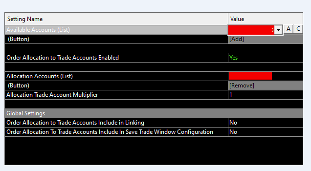 - Available accounts list = 3 (So, I can now see 3 accounts added). - Order Allocation to Trade Chart Accounts Enabled = Yes - Allocation Accounts list is populated with 2 accounts it will not add the "PracticeAccount123456" to the list. - Allocation Trade Account Multiplier = 1 - Global Settings (both are set as No) Menu >> Settings >> Enable Order Allocation To Trade Accounts = Yes Menu >> Chart Trade Mode On Menu >> Trading Chart Dom Mode On Are there any other settings as the trade is only sent to the account selected in the DOM order panel and not the other 2? Many thanks. Date Time Of Last Edit: 2024-02-06 19:01:36