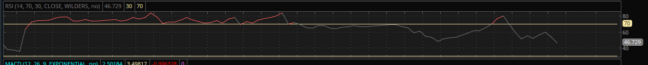 Attached is a Study Collection that does what you want for coloring above the 70 line. You should be able to use this as a starting place to then setup the second Color Bar Based on Alert Condition for when the RSI is below 30. Note that you may see some peaks that are not colored, or the line is not fully colored, this is because the way the drawing works, if there is a quick jump above 70 for 1 bar then all you would see drawn is a dot at that point since there is nothing to connect it to on either side. The only solution to this is to smooth out the RSI so there is not as many of these quick jumps. Refer to the following for how to use a Study Collection provided by us: Study Collections: Using a Study Collection Provided by Sierra Chart Support For the most reliable, advanced, and zero cost futures order routing, use the Teton service: Sierra Chart Teton Futures Order Routing |