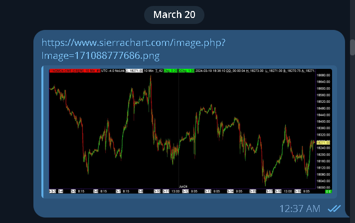 There is now support to take an image of the chart if an alert originates from a chart, to capture the state of the chart at the time of the alert, and save that to a file. The setting is: Global Settings >> General Settings >> Alerts >> Alert Settings >> "Capture Chart Image on Alert for Chart"; And if this setting is set to Yes for the same Alert Number, a link to the image will also be added to the Chat Group and then relayed to Telegram if that is enabled for the Chat Group: "Send Alert as Chat Message when this Alert is Triggered (External alerts)" The chart is useful to examine the state of the chart at the time of the alert. This will be in version 2621. Available now. Update: See the attachment for an example of what this looks like in Telegram. You can then click the link in Telegram and being that Telegram has already pre-fetched the image, it will then be displayed within the Telegram image viewer. So you have immediate access to the state of the chart, at the time of an alert. This all occurs in real time and instantly. So you have immediate real-time access, to events, meeting your conditions, on your mobile device and can see a chart at that moment in time which is up-to-date. Sierra Chart Support - Engineering Level Your definitive source for support. Other responses are from users. Try to keep your questions brief and to the point. Be aware of support policy: https://www.sierrachart.com/index.php?l=PostingInformation.php#GeneralInformation For the most reliable, advanced, and zero cost futures order routing, use the Teton service: Sierra Chart Teton Futures Order Routing Date Time Of Last Edit: 2024-03-21 06:21:48