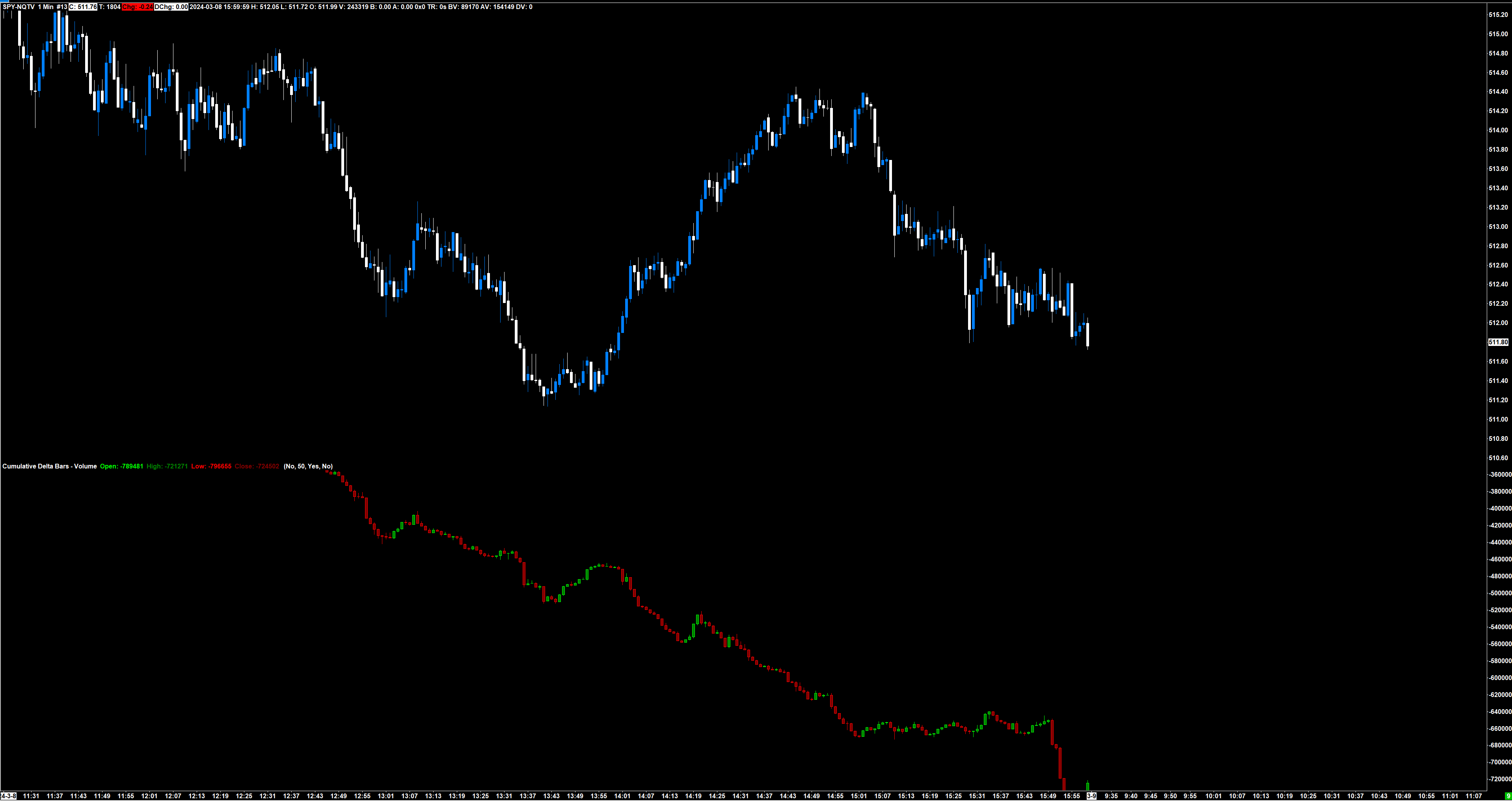 If there are more net sellers, net volume being done on the bid. First I thought the massive volume price divergence was weird. Because I knew ES was not going to look like that. I pulled up SPY on trading view and saw CVD, how I thought I would, trending upward with price, opposite to SC CVD. And TW CVD match up with volume, and volume matched up with candle stick color. So in SC on SPY consolidated tape I looked at Volume to CVD in SC and it didn't match up that well. Then I compared Volume study to Price candle stick color and that was 100% correct every green bar matched with every blue candle, and every red bar matched with every white candle. And I did the same for ES futures, every volume bar matched up with corresponding color, in this same time period that we are looking at spy. March 8th 2pm - 3pm EST. So Total volume is a combined ask + bid volume with no net difference calculation, and shows the larger volume side based on color, shouldn't that color match up with CVD and/or ask/bid volume difference bars, because those two studies show the predominate side, and momentum of buyers or sellers on a histogram or chart basis, matching the predominate color in volume study. EDIT* Someone pointed out to me that the Volume study... is not calculated from the predominate volume of bid + ask, and that it is calculated according to price Open/Close color change..... Nonetheless TW CVD is very different than SPY consolidate Tape. TW CVD makes more sense following the usual trend with price. Seeing a completely negative correlation between Price and CVD for over an hour. Is an anomaly. You won't see this happen in Futures and that's all I've been looking at. This is the first day that I've become aware of this on SPY Date Time Of Last Edit: 2024-03-11 02:44:45