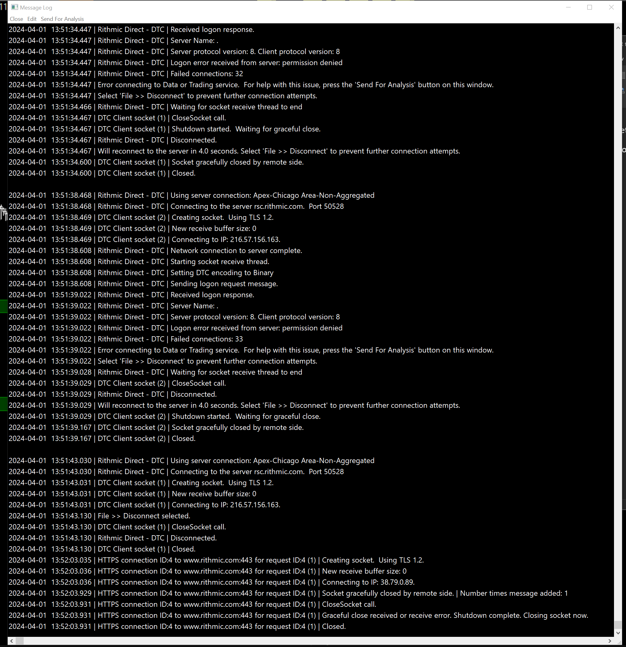 Refer to the following: Rithmic Trading Platform Service: Permission Denied Resolution Procedure For the most reliable, advanced, and zero cost futures order routing, use the Teton service: Sierra Chart Teton Futures Order Routing |