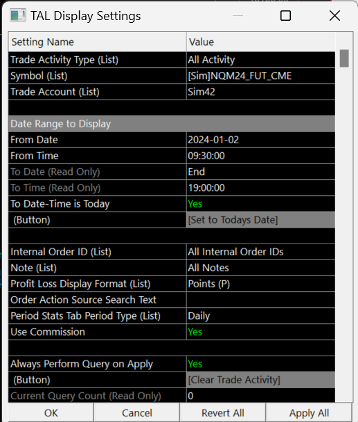 It's set to All Symbols, Non-Simulated. I also tried a specific symbol, MNQH24. Both ways provided no results. From date is set to a week ago and To Date is set to End. To Time is set to end of day, 2 pm PST.