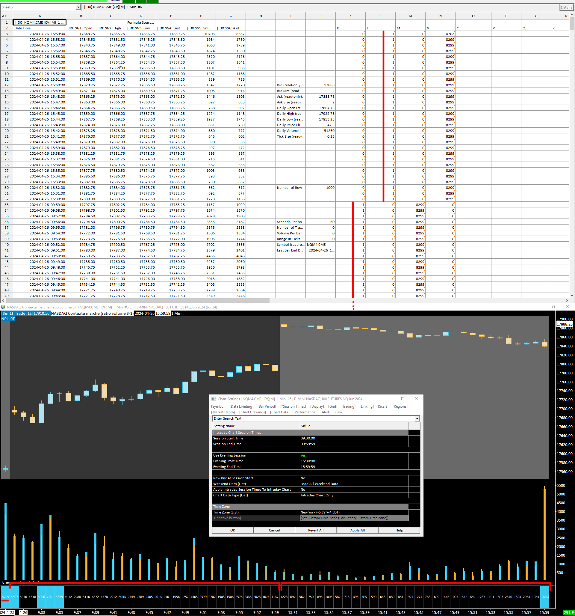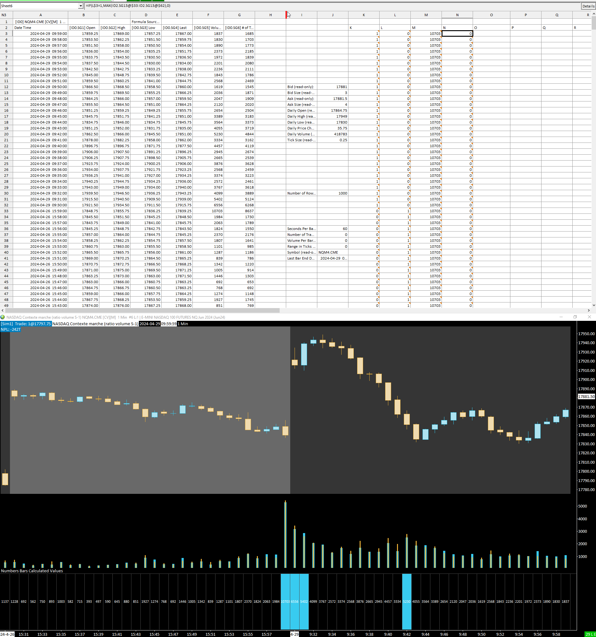 Hello everyone, I have a problem with a spreadsheet, here are the formulas in the different columns and ID2.SG13 corresponds to the total volume of the bar. K: Period variable (time) =AND(FRACTIME(A3)>=TIME(9,30,0),FRACTIME(A3)<TIME(9,59,59)) L: Period variable (time) =AND(FRACTIME(A3)>=TIME(15,30,0),FRACTIME(A3)<TIME(16,59,59)) M: Maximum volume calculation period 9:30 a.m.-10:00 a.m. =IF(K3=1,MAX(ID2.SG13@3:ID2.SG13@62),0) M: Maximum volume calculation period 3:30 p.m.-4:00 p.m. =IF(L3=1,MAX(ID2.SG13@3:ID2.SG13@62),0) My chart is set in a session 9:30 a.m. - 9:59:59 a.m. and with an evening session 3:30 p.m. - 3:59:59 p.m. (see capture). My goal is to obtain the maximum volume between 9:30 a.m. and 10 a.m. on one column and on the other between 3:30 p.m. and 4:00 p.m. The problem is that there is a gap, it takes into account the previous candle. That is to say that here on column M (bottom), the maximum volume between 9:30 and 10:00 should be 7401 and not 8299. I don't understand where the problem could come from. Someone would have any idea ? |