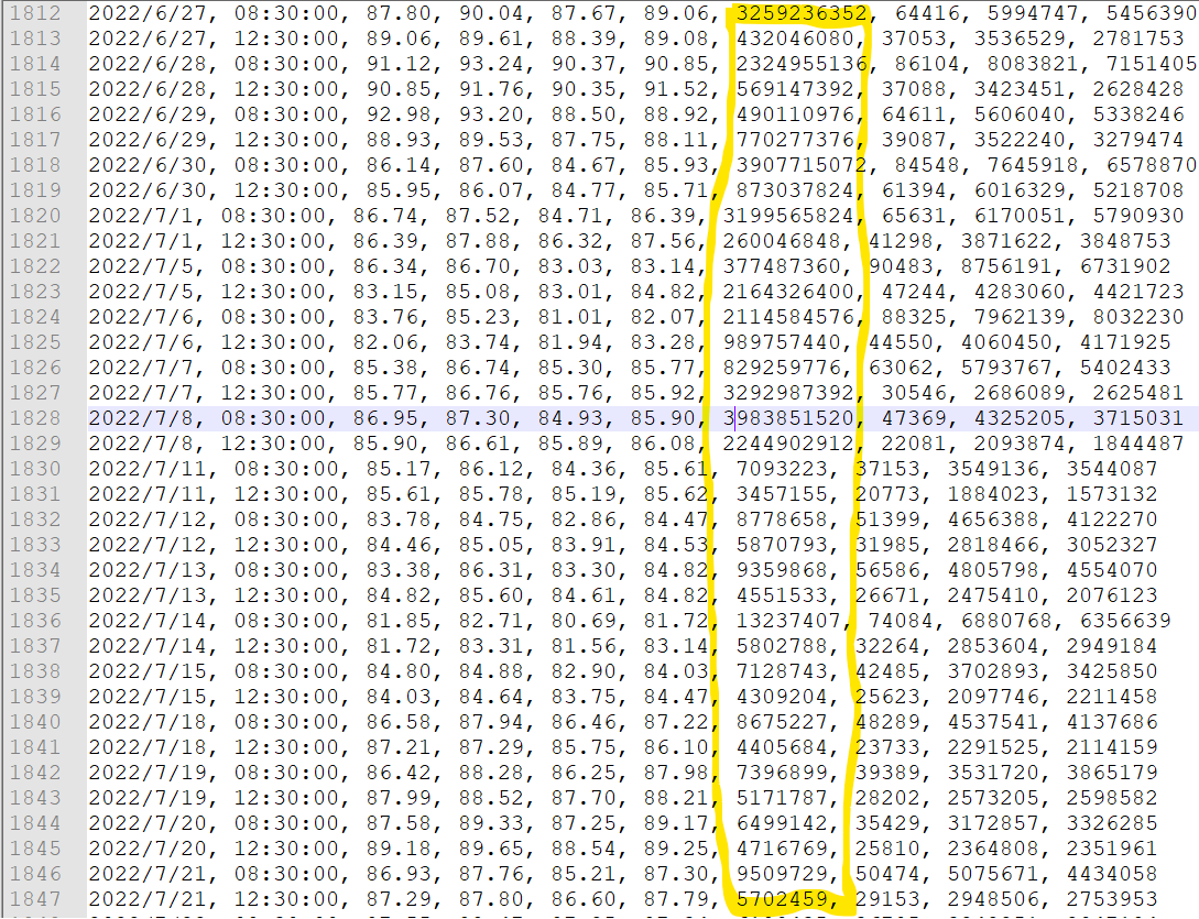 Done. I ran this step roughly 8 times while checking the 7/8 to 7/11 values: - 1 run the numbers from 7/8 and older were different (still large) but did not match yours. - 1 run the numbers were smaller and closer to the 7/11 values back until May 2022 when they get large again. - All others matched what I originally posted. I also believe the values you posted are incorrect from 7/8 and older just like mine but different values. The volumes we believe to be correct (7/11 and newer) are less than 1% of the values 7/8 and older. I tried changing ETH/RTH hours and varying the bar period but the data still shows odd behavior. |