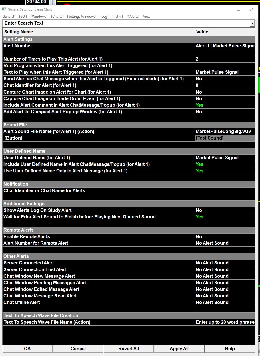 You have the sound file in the correct location. You are not thinking of the Alerts in the way they are setup. The "Alert Sound" you select in the Alerts tabs is an Alert Number (Alert1 through Alert200). You assign an actual sound to the alert number in the General Settings. Refer to the following: General Settings Window: Configuring Alert Number Instructions For the most reliable, advanced, and zero cost futures order routing, use the Teton service: Sierra Chart Teton Futures Order Routing |