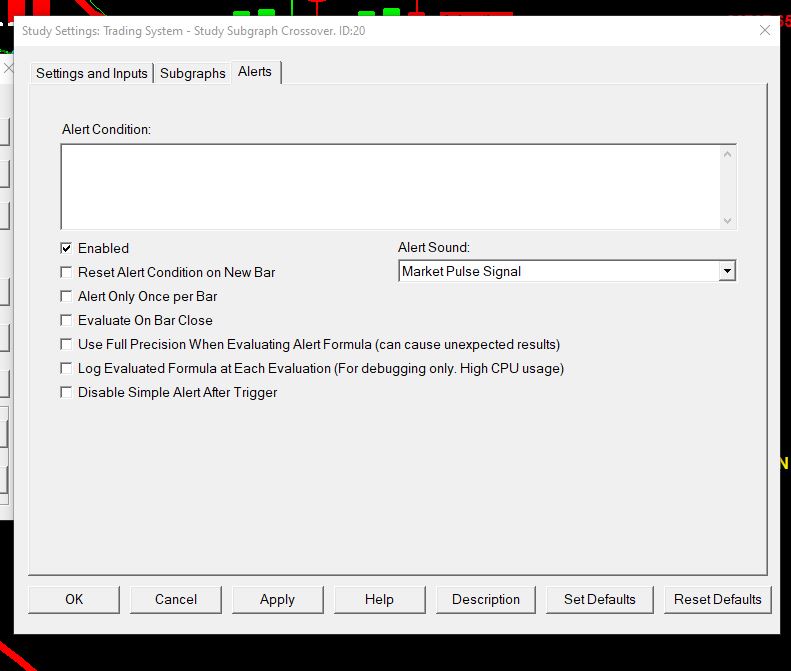 You do not have an Alert Condition defined, therefore you are not getting an alert. In this case, we assume you want the alert to occur when you get a valid condition for this "Trading System - Study Subgraph Crossover" study. In which case, you would enter the following for the Alert Condition: =OR(SG1, SG2) In this case, since the alert is set on this particular study, you do not need to reference the ID of the study. For the most reliable, advanced, and zero cost futures order routing, use the Teton service: Sierra Chart Teton Futures Order Routing |