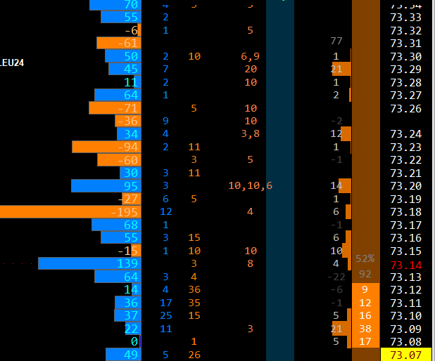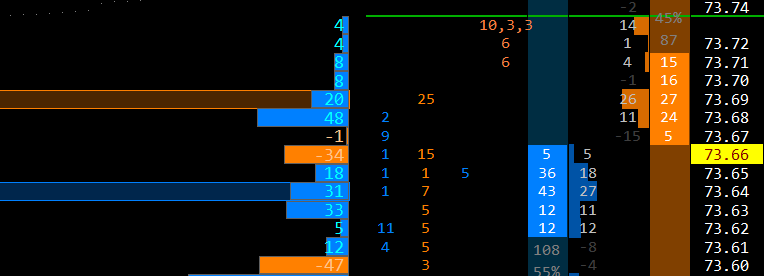 good morning! Thanks again your help is invaluable. Here was this mornings first attempt, followed by (what i thought) was a meaningful explanation to AI Please see attached and here was the prompt: "in this example, a buy trade would be opened at the current price (73.66, as the buy conditions have been met at 73.64 (the bidpullingstacking>=threshold - hence the blue highlight AND the volume profile number is a number>0. The opposite would be true for a sell, as you can see from this example however, the ask highlight (orange) meets the askpullingstacking threshold but does not meet the volume profile condition at the price (73.69) as the volume profile level has a positive integer |