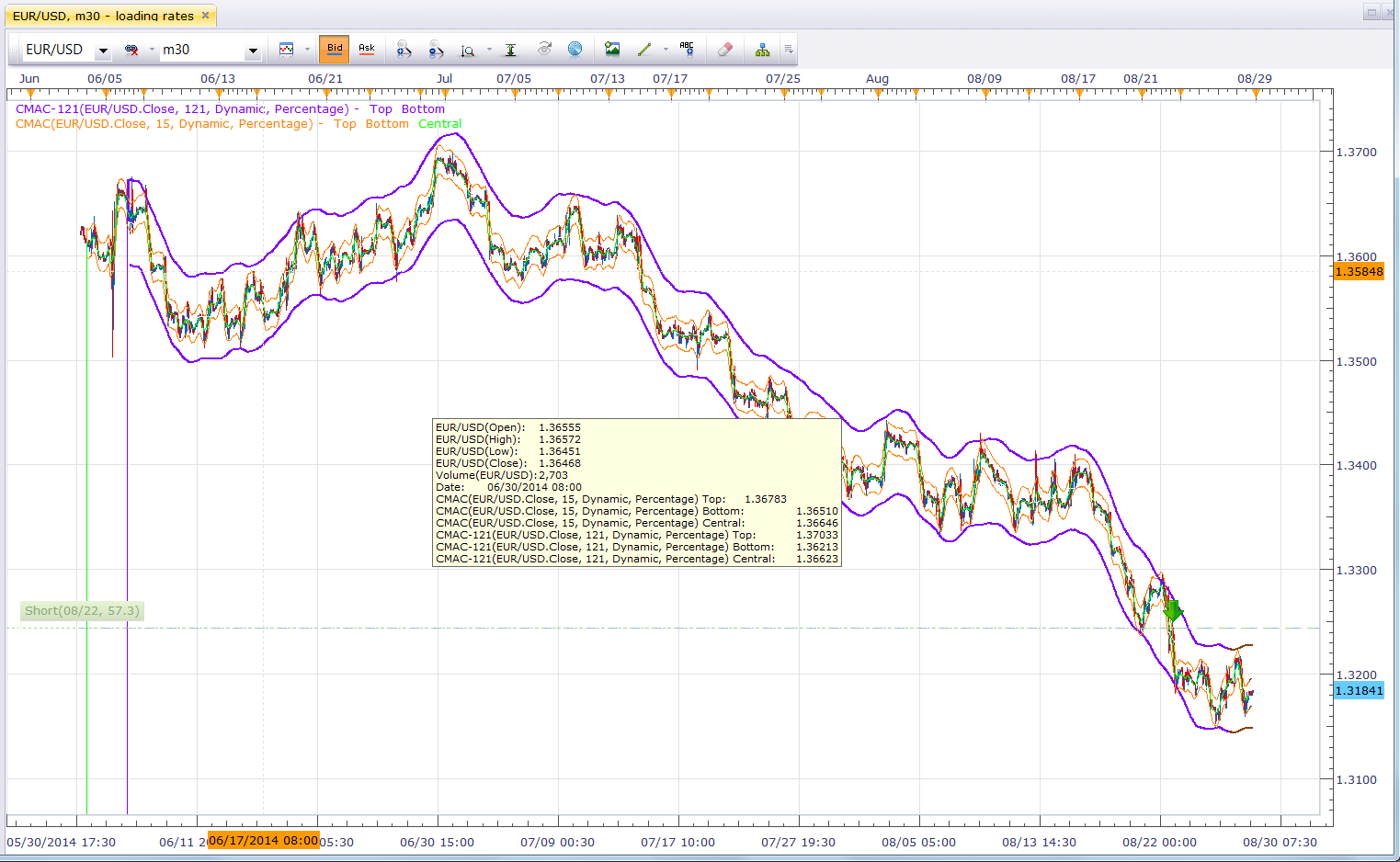 FX Trading Station (fxcm.com) has a plugin called Centered Moving Average Channel (http://fxcodebase.com/code/viewtopic.php?f=17&t=32423.). I used it to make a 15 day channel, then a second copy to surround it with a 121 day channel (see img). This manual composite can not yet save all my settings. I believe that this two centered MA channel approach sort of automates trendlines and can help to reveal cycles. I view it as a simplified, manual, alternative to Hurst analysis. Would someone adapt the concept to SierraChart? |
