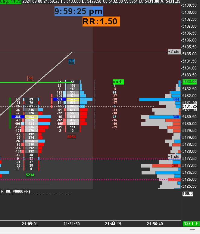 Thanks again John...so quick question if i want an alert for a VWAP when price either equals it or crosses over it ...would the following be the correct thing to enter into the study alert? =(C>=SG1[-1]) The reason I ask is because i used this and i did not get an alert when the actual price broke the vwap by .01...price traded 5765.75 while vwap was 5765.74... see the first picture attached attached picture for clarity. Eventually price traded 5766 amd the alert triggered... Can you please tell me what i am doing wrong Date Time Of Last Edit: 2024-09-21 15:52:56