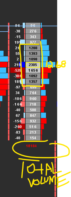 This was awesome thank you so much...I asked this question before and did not see how to do it and apologize to ask again...is there a way I can show the % of bars total volume at each price point in the bar (range bar)..I am curious if the % can show in the histogram??? I have attached a picture of a numbers bar with an example to clarify my question..this example is ony at 1 price point i would like percentages at all price point.. Once again I am sorry for any confusion. |