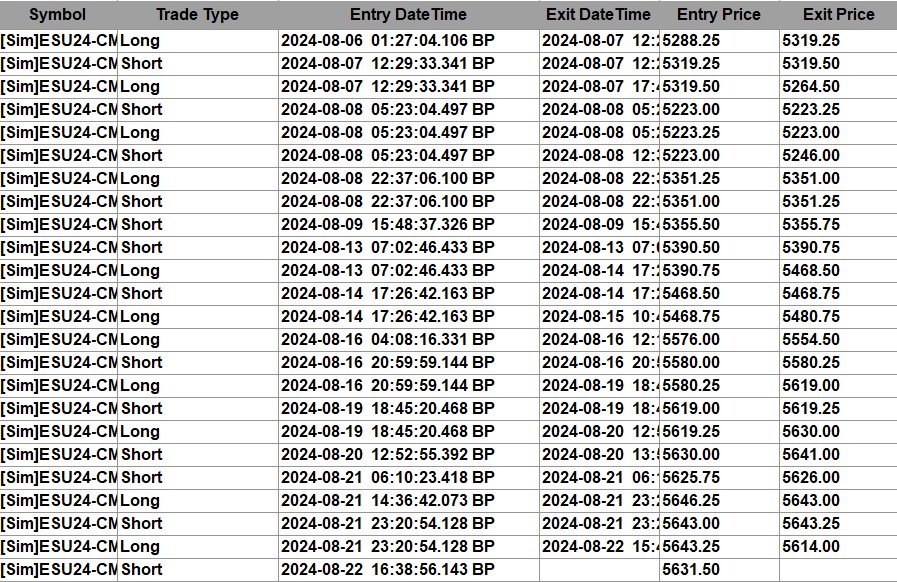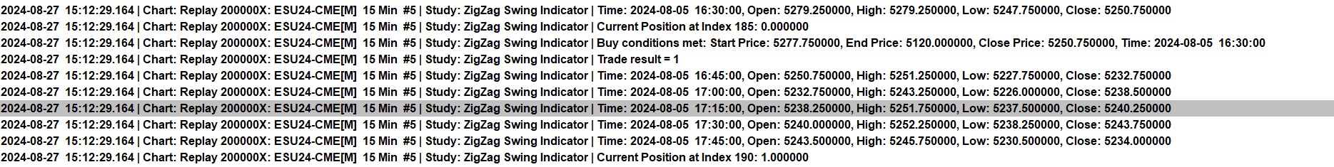 I apologize, I think there is still some confusion. There are a total of 5 "sources" I'm using to validate the backtest trades. 1) literal arrow drawings I'm creating via the chart drawing capabilities in the backtest 2) printed trade result (trade result = 1) of each trade 3) Printed current position using sc.GetTradePosition 4) buy / sell orders shown on chart via the Show Order Fills setting 5) trade activity log Sources 1-3 all show the "correct" trades being taken. That is, the backtest working as it should. Sources 4 and 5 show entirely different, incorrect orders. Let me share an example with pictures. The first trade in the backtest should be taken on 8/5 at 16:30 (15m chart). I've attached 3 images. My message log, the picture of the chart, and the trade activity log. In the message log, you'll see that a message printed saying buy conditions were met, and the trade result printed as 1 (successful). The current position 5 minutes later also shows long 1 contract. In the chart image, you'll see a light blue arrow at the time the trade was SUPPOSED to be taken. However, you'll also see the green triangle much later on at a different price displayed by the show orders / fills setting. Lastly, in the trade activity log, you will see no trade taken on 8/5 at 16:30. |
