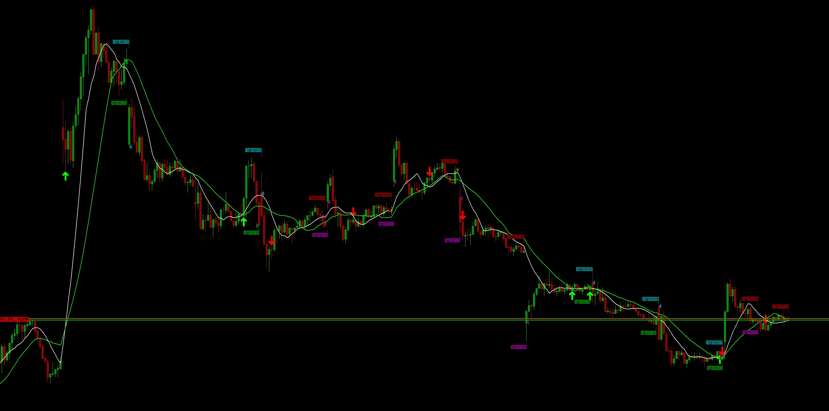 Attaching picture here. Orders should simply be made on the moving average cross, as per Sierra's Trading Example MA Crossover strategy code. Picture looks normal and correct. That system enters on close of bar. Where do you see errors? |
