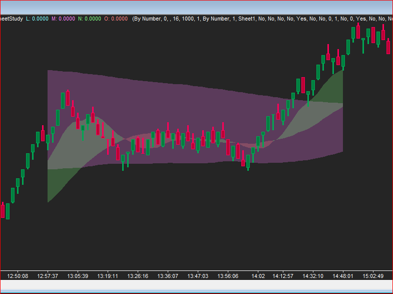 John and K-1: This can be done with the Spreadsheet Study study. The concept: 1. Use a formula in K3 like this: =AND(MIN(ID1.SG1@3,ID1.SG2@3)>MIN(ID2.SG1@3,ID2.SG2@3),MAX(ID1.SG1@3,ID1.SG2@3)<MAX(ID2.SG1@3,ID2.SG2@3)) -where ID1 is the fast cloud and ID2 is the slow cloud. (Two Moving Averages studies were used in my example.) This goes TRUE when the entire fast cloud is inside the slow cloud. To go TRUE when the edges of the fast cloud are inside the slow cloud, use a formula like this instead: =AND(MAX(ID1.SG1@3,ID1.SG2@3)>MIN(ID2.SG1@3,ID2.SG2@3),MIN(ID1.SG1@3,ID1.SG2@3)<MAX(ID2.SG1@3,ID2.SG2@3)) 2. Use 2 adjacent Formula Columns, one pair for each of the clouds. Create the visible clouds with these subgraphs by using formulas like these: L3: =IF(K3=1,ID1.SG1@3,0) M3: =IF(K3=1,ID1.SG2@3,0) N3: =IF(K3=1,ID2.SG1@3,0) O3: =IF(K3=1,ID2.SG2@3,0) -refer to above for which each ID# is what. These formulas will only display the MAs when the fast cloud is inside the slow cloud. Adjacent columns can be used with Fill Top/Fill Bottom draw styles to create a cloud. 3. Hide or Remove the studies used to create the full clouds. Date Time Of Last Edit: 2024-08-27 18:22:17