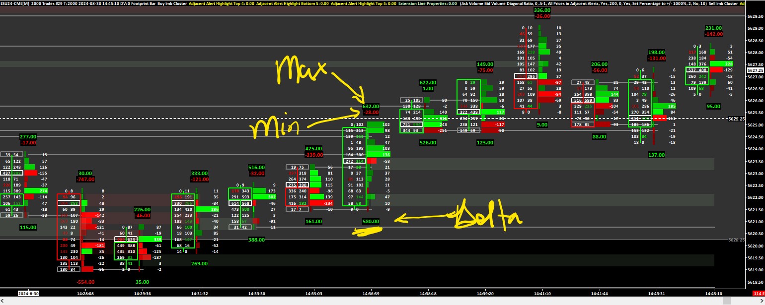 I have asked this before but I couldn't articulate precisely what I wanted, but I'll try this time. 1. In the attached screenshot is my Footprint chart. I want my delta values (bottom of bar) to be colored according to a range in decreasing brightness. The ranges are 300+, 300-200, 200-150, 150-80, 75 and below. 2. To visual display the same info above is it possible to have volume circles that match the ranges stated above based on circle size and/or color? |
