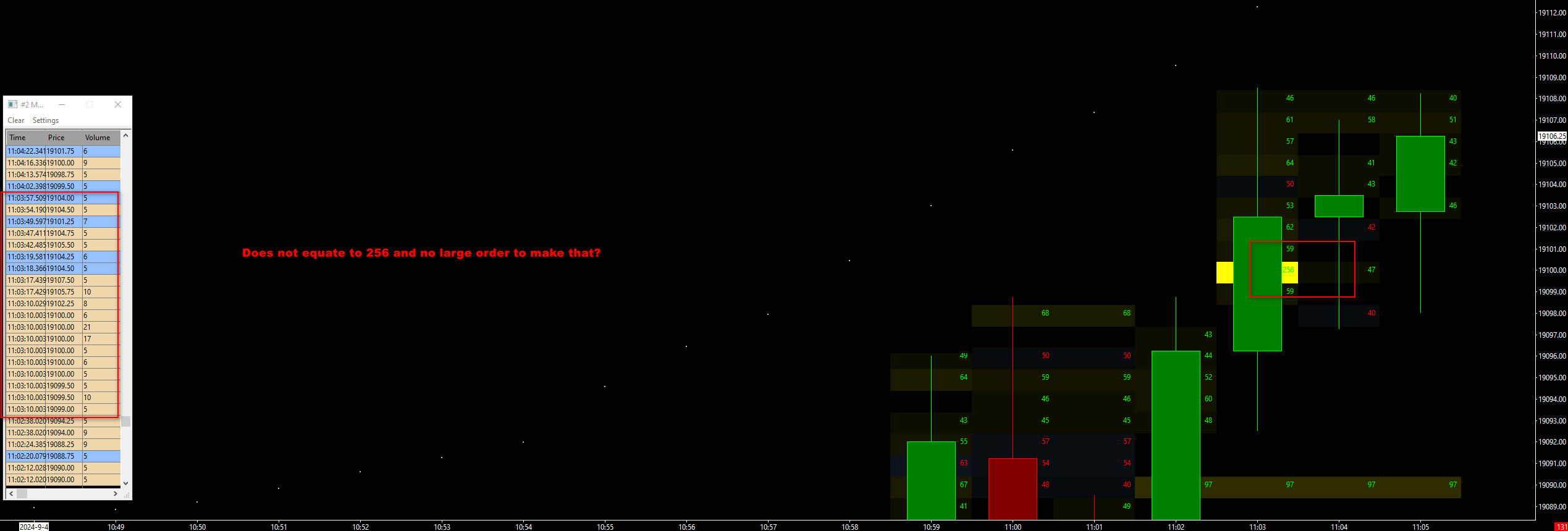 Thanks. Market Depth Historical is the study. I believe I have it working but I found something in it that confused me. You can see on the chart (attached) that there was 256 units recorded on the 1min chart bar on the right but you can see the DOM on the left did not add up to that number during that 1min bar.