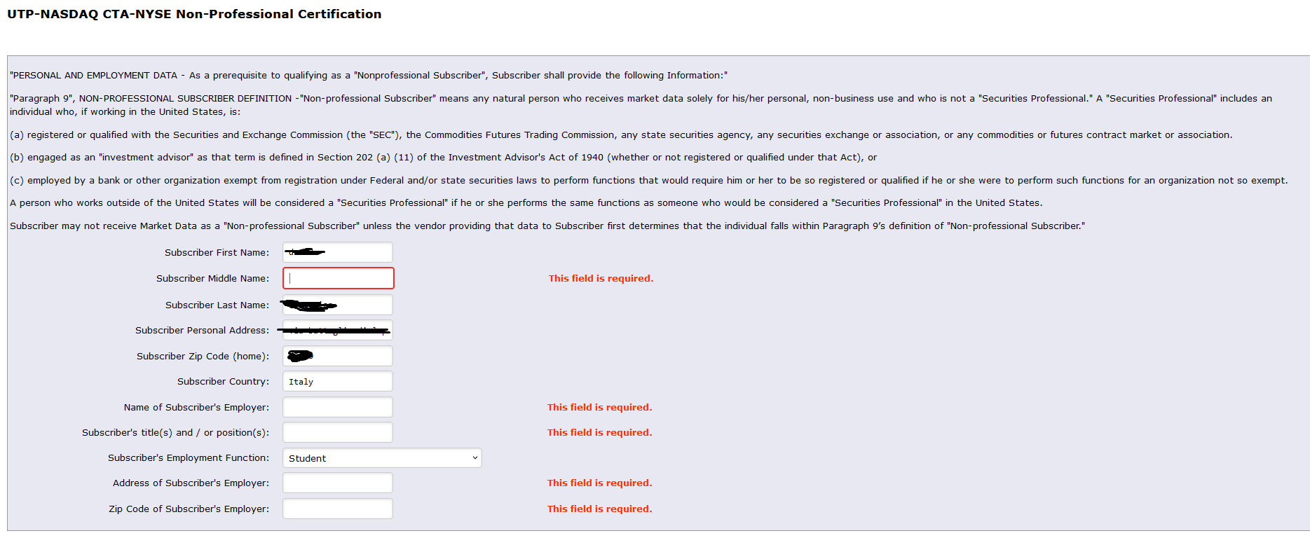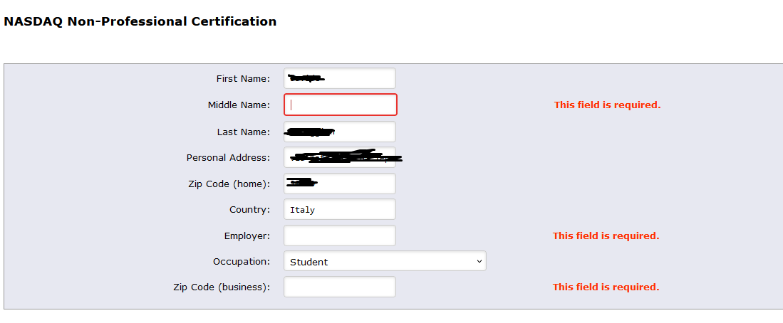 Thanks for your answer, of course Nasdaq in not an exchange, i'm sorry, i'm italian maybe i expressed myself not correctly, by the way, i'm signing the non professional cetification for both, "NASDAQ Total View" and "US Equities Consolidated Tape", since i want total volume and market depth data. As shown in the attached screenshots, the form is asking me about: 1) Middle name: in italy very few people have a middle name, I don't have it, I know that in america often time the middle name is the mother's name, but in italy it's not, and is complitelly wrong to use it. So i can write my mother's name but at that point i'm signing as another person 2) Informations about my employer, but i'm an university student so i don't have it As these informations are mandatory, i don't know how to fill the form Thanks, kind regards |
