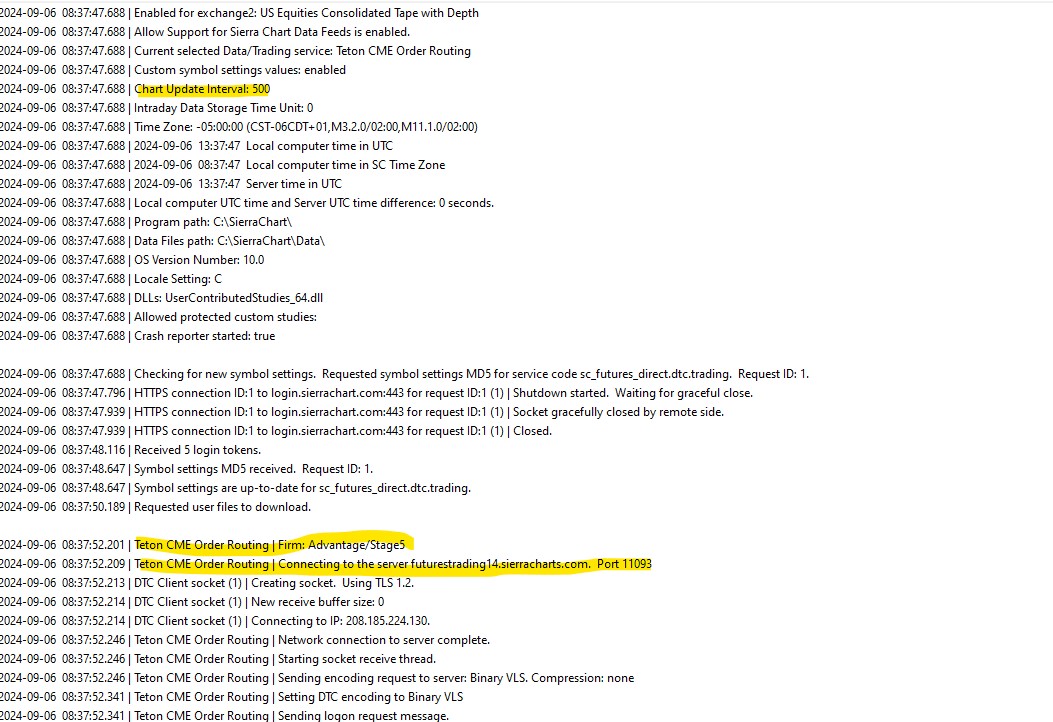 Ok, I was reading the historical download server. My time is good. I see in the log it says "Chart Update Interval" is 500 (assuming that is milliseconds). Log also has real time cme connection for the NQ chart I trade, I'm connecting to is ds30, I think. I also see at the beginning of the log the Teton CME order routing/Advantage/Stage5 is connected to futurestrading14. I attach some screenshots